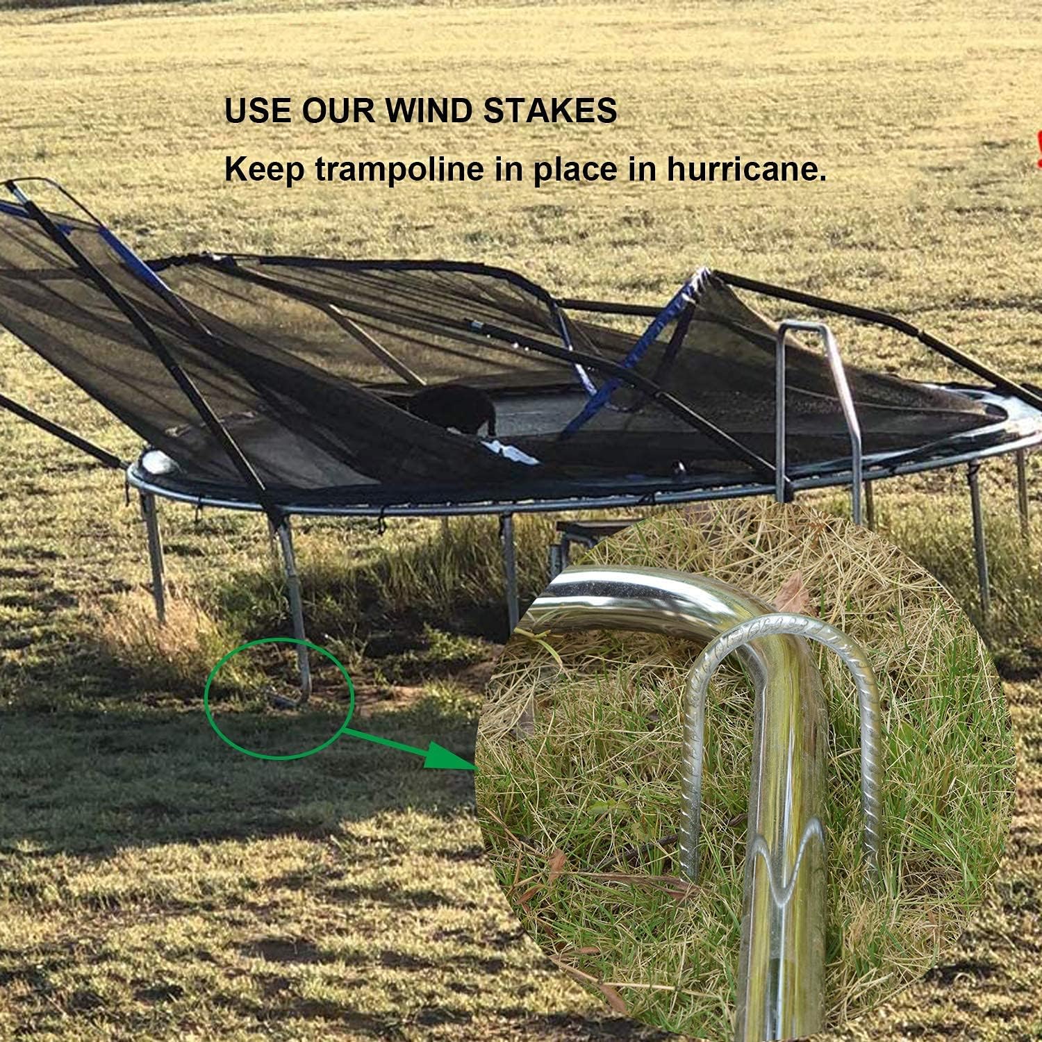 • KEEP TRAMPOLINE IN PLACE - If you have a trampoline, it is necessary to add these heavy duty wind stakes to reinforce and keep it in place when the trampoline is used, especially in the place always meet hurricane or other strong winds. These ground anchors will keep your trampoline from flipping or moving during use, and kids will not fall off or hit to ground.