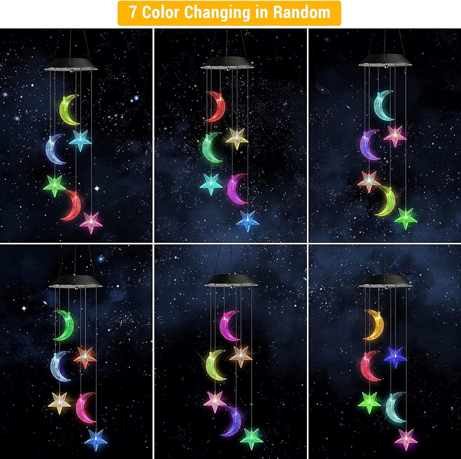 • 🌙【7 Colors Changing Decorative Mobile Lights】 The solar Moon and Star decorative lights change color alternatively between red, green, orange, blue, yellow, purple and white, one color gradually transitions into another creating a surreal visual effect, adds a charming display of lights and make your surroundings look dreamy and magical. This solar wind chimes will definitely suitable for your bedroom, patio, balcony, window or garden decoration.
