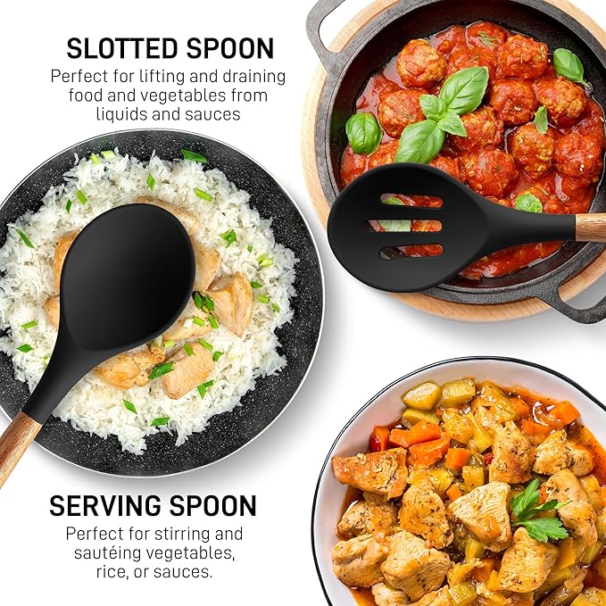 • PREMIUM QUALITY THAT LASTS: These kitchen utensils are made of food-grade silicone with a heat resistance of up to 464°F, making these ideal for stirring food in hot pans. The handles are crafted from authentic acacia hardwood, perfect for long-term use.