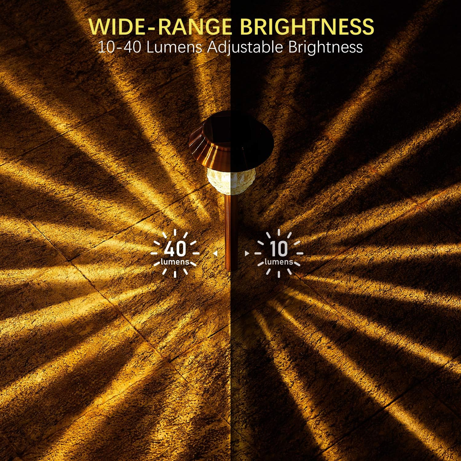 • Customize Modes & Long Lasting: Solar garden lights outdoor with optional modes to choose from 10 - 40 LM. Low Mode: 10 LM brightness is perfect for winter lasting up to 10 H. High Mode: 40 LM brightness is perfect for summer lasting up to 5 - 6 H.
