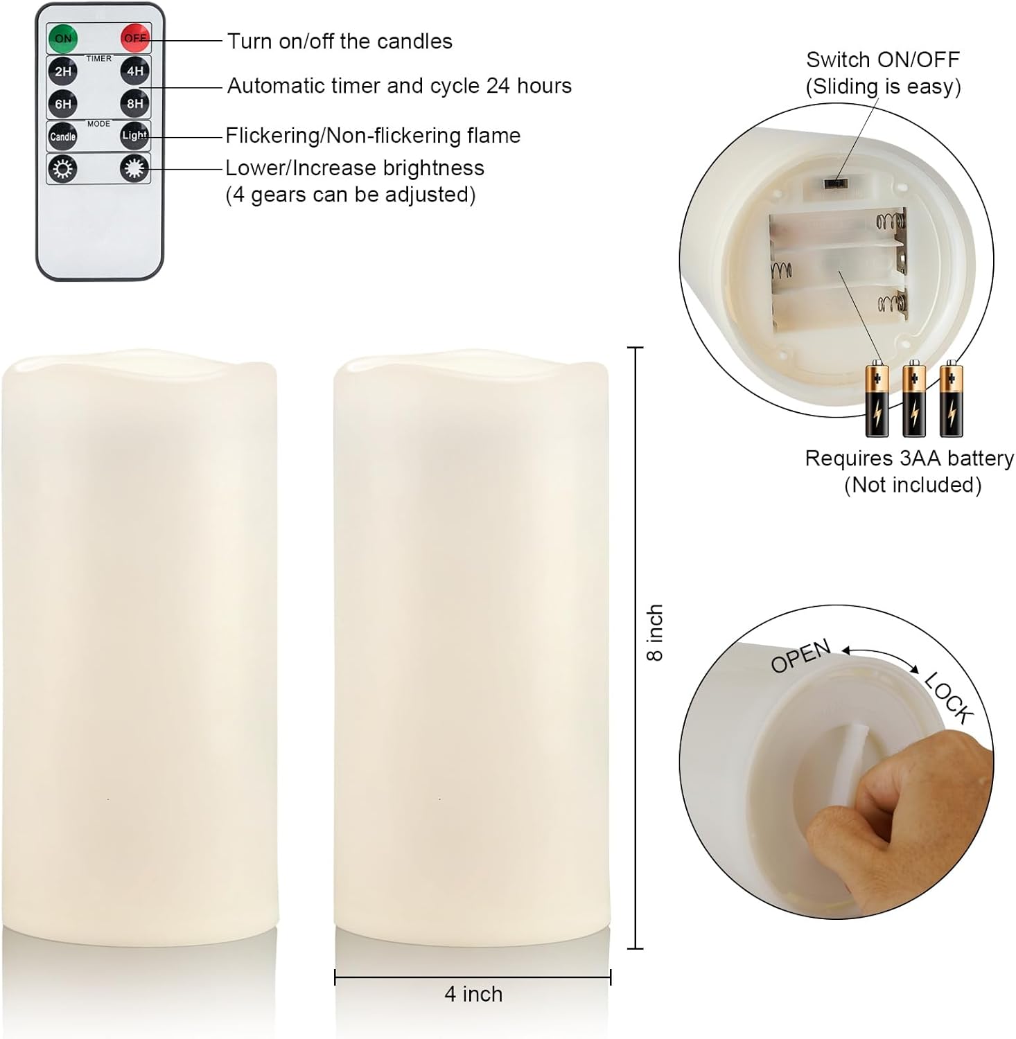 • Smart Remote Control and Long Last: The remote control provide a 2H/4H/6H/8H timer options, which will save your trouble to turn the timer candles on/off because they will come back on automatically at the same time every day. Also, you can adjust the light modes(flicker/steady glow) and brightness level as you want.