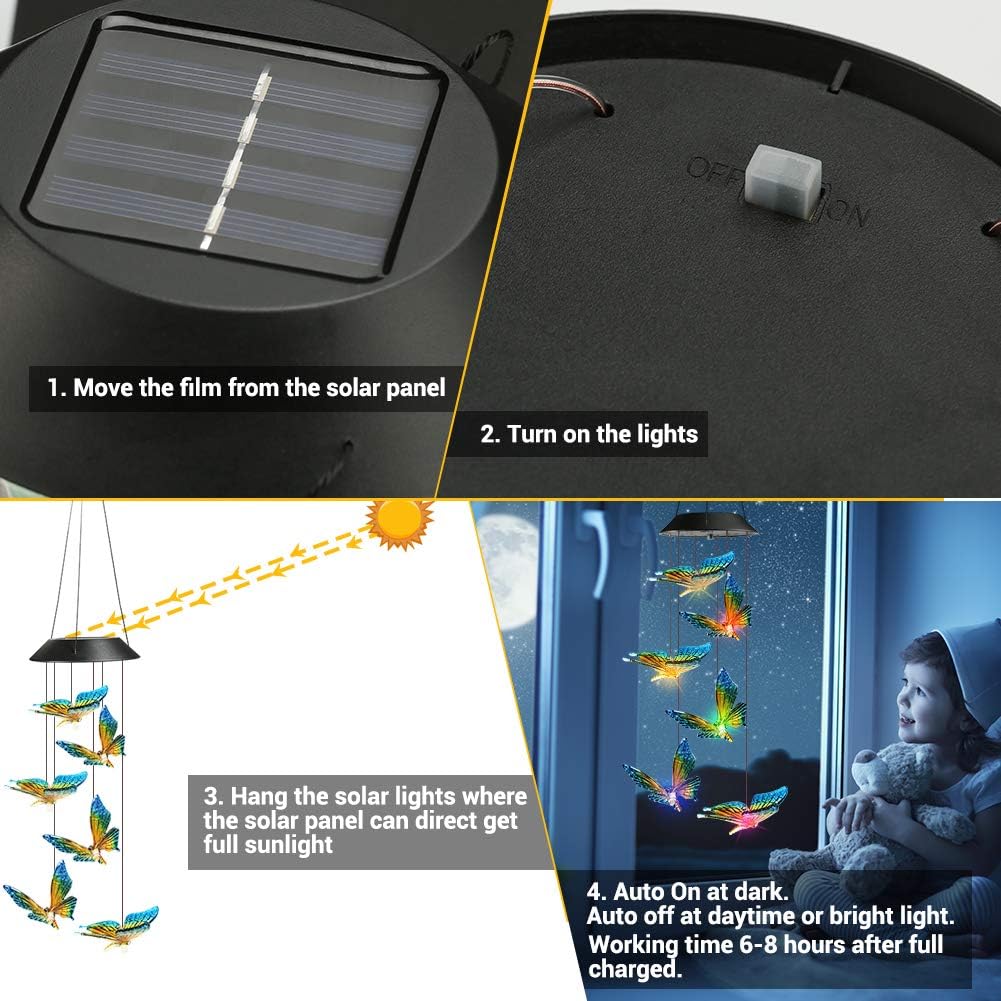 • 【Solar Powered Wind Chimes】 Featuring a unique design with 6 butterflies shaped lights charge automatically in the daytime and light up at night, free your hands, new version solar panel absorbs energy quickly, the solar Christmas lights can last up to 8-10 hours after fully charged.(Christmas Lights, Christmas Decorations, Easter Lights, Easter Decorations, Gift for Mom, Gifts for Wife, Gifts for Grandma, Mom Gift, Grandma Gift, Birthday Gift for Mom, Birthday Gift for Grandma)