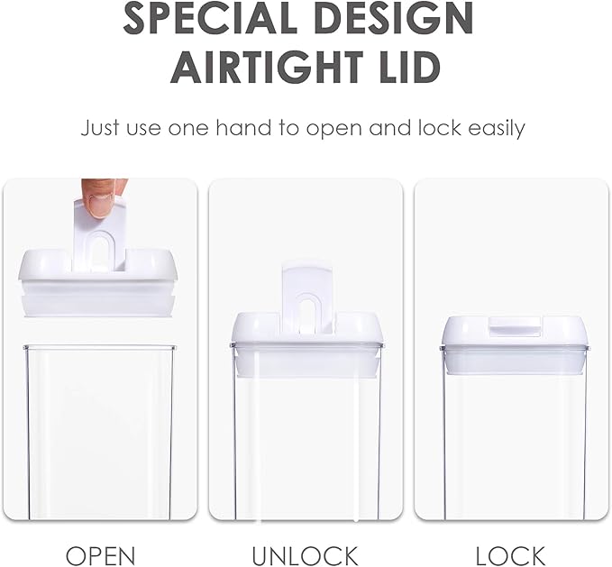 • Air-Tight to keep food dry and fresh----With special sealing mechanism, you can open or close our plastic containers safely by using only two fingers. Simply flip the ring to open or flip the ring down to lock and seal.