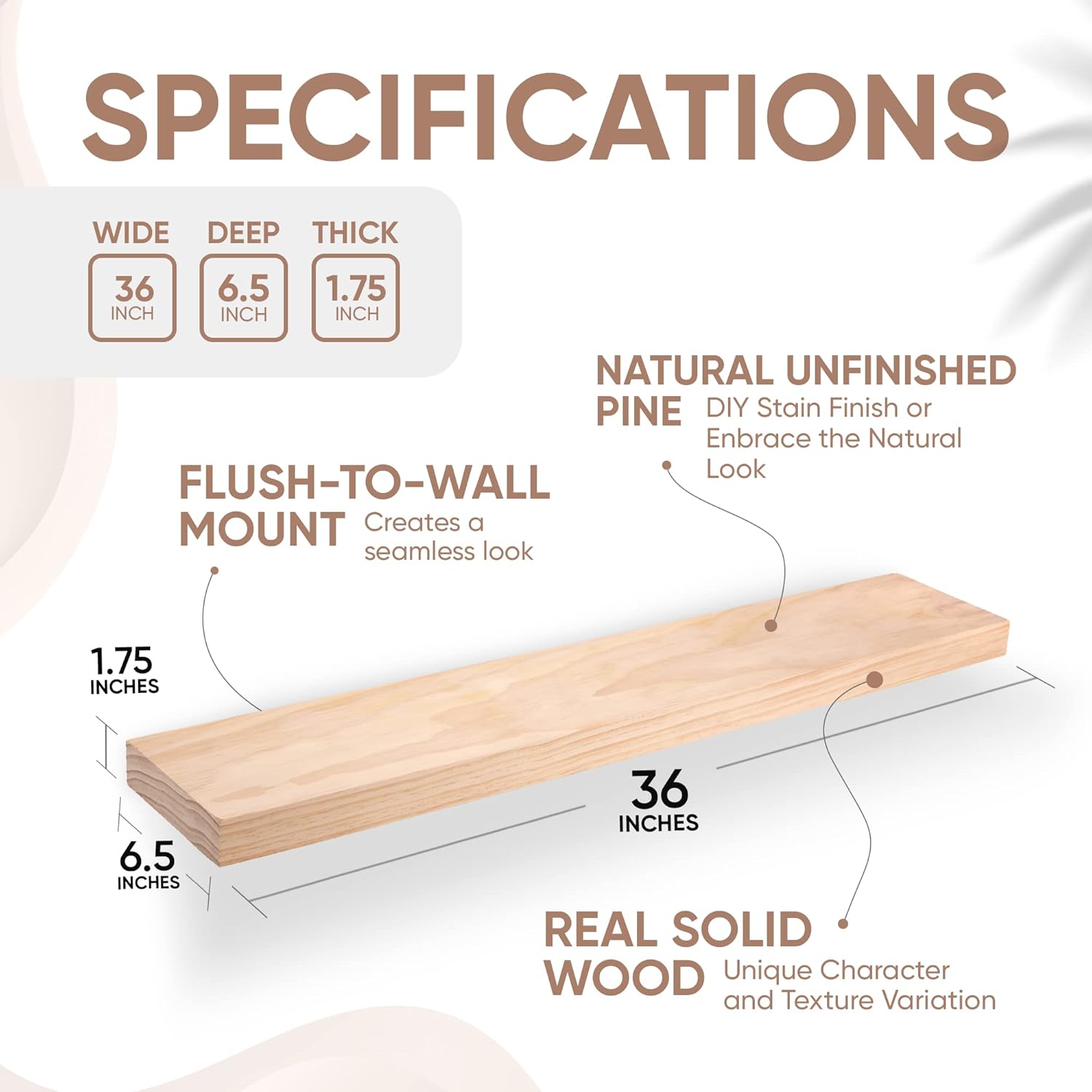 • AUTHENTIC WOOD GRAIN - Enjoy the timeless elegance of real wood. Handcrafted from the finest 1.75" Thick natural pine wood measuring 36" Wide x 6.5" Deep x 1.75". Our shelves highlight the inherent charm and durability of high-quality wood. Each Shelf reveals its unique character of knots and natural wood grain; each ledge is a little different but equally stunning.