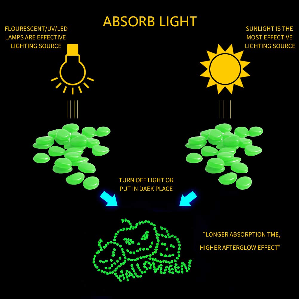 • GLOW IN THE DARK PEBBLES: These glowing rocks absorb and store energy from sunlight and other light sources,light up in dark environments. These glowing pebbles can glow for up to 1 to 2 hours in darkness after a full day in the sun.These glow stones are green in the day, but they are going to be Blue glow pebble rocks at night! Please radiate them with light again if they are not bright enough.
