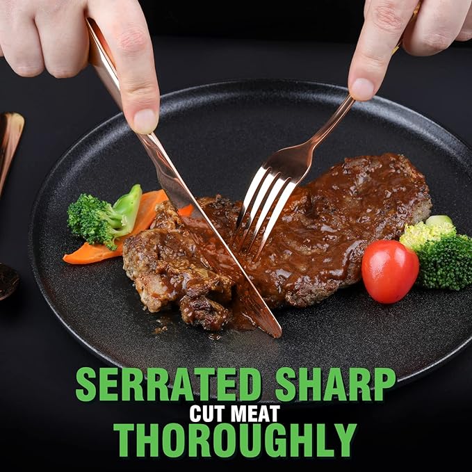 • 【GORGEOUS AND BEAUTIFUL APPEARANCE】: The high-grade mirror polishing process makes the surface of the knife and fork soft and smooth. This copper/rose gold silverware set has good reflective properties, will shine with a copper/rose golden glow to add brilliance to your dining table.