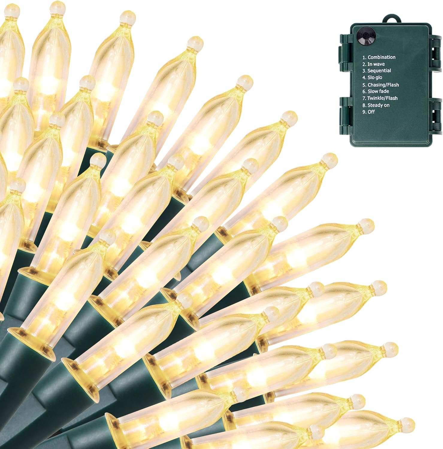 • BATTERY OPERATED WITH TIMER: 3 AA batteries are required for power supply (NOT INCLUDED). Press button on the battery case for 8 modes adjusting: COMBINATION, IN WAVES, SEQUENTIAL, SLOGS, CHASING/FLASH, SLOW FADE, TWINKLE/FLASH and STEADY ON. Just light up the light with any mode you like to create great festival holiday joy atmosphere