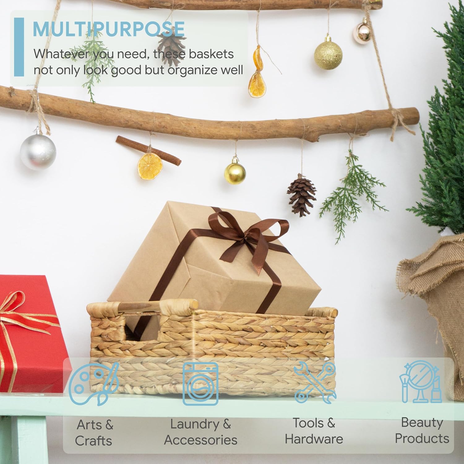 • ✅ Convenient and Attractive - Whether it be by way of pure decor, storage, or organization for kitchen, pantry, or bathroom. This natural baskets with handles suit your home in every way. The rectangular baskets wicker is great for magazines, games, pet toys, media, household items.