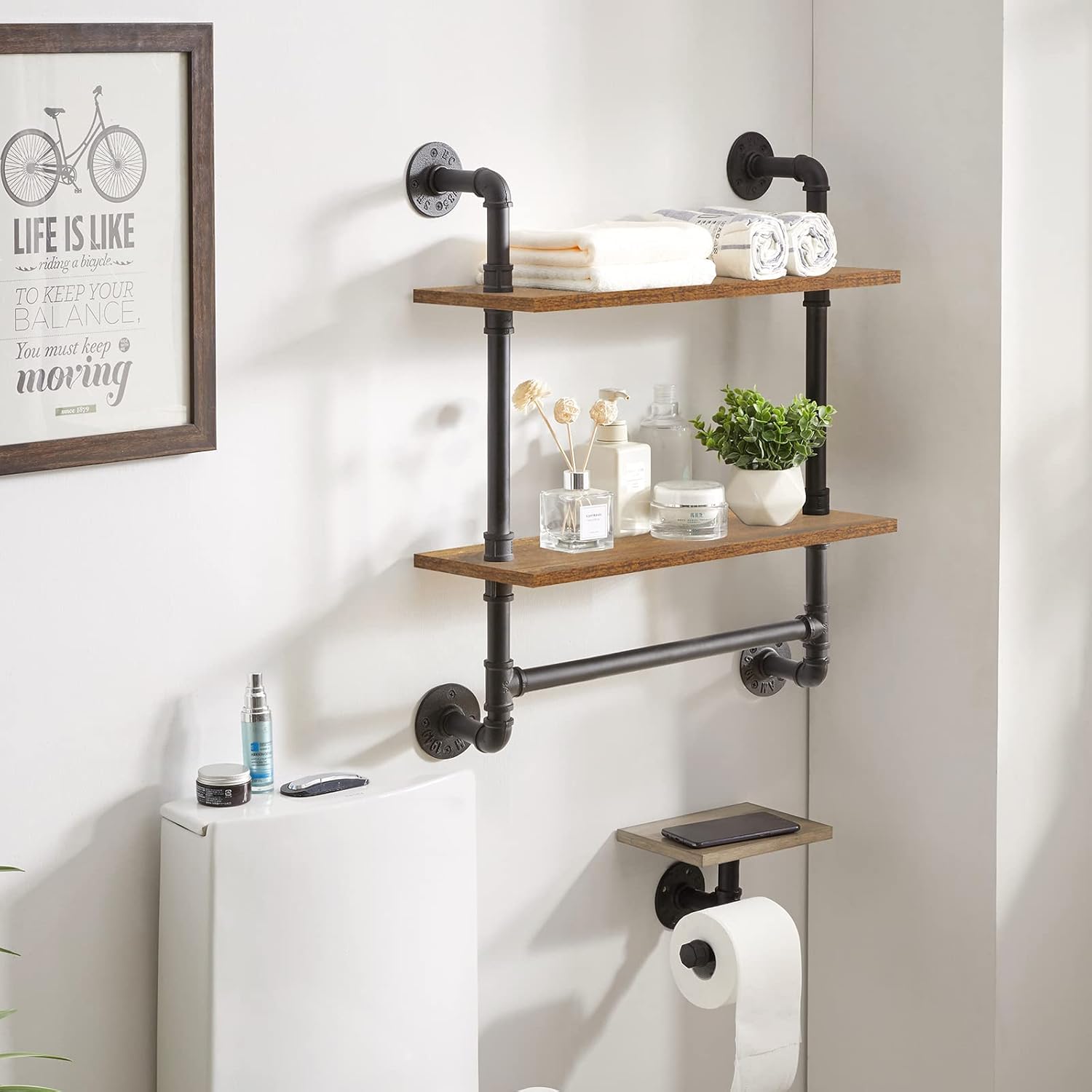 • Sturdy Rustic Pipe Shelf: This floating rack is made of strong metal tubes and thick particleboard and can hold up to 50 pounds per layer. There are towel bar under the ledges to hang family towels.