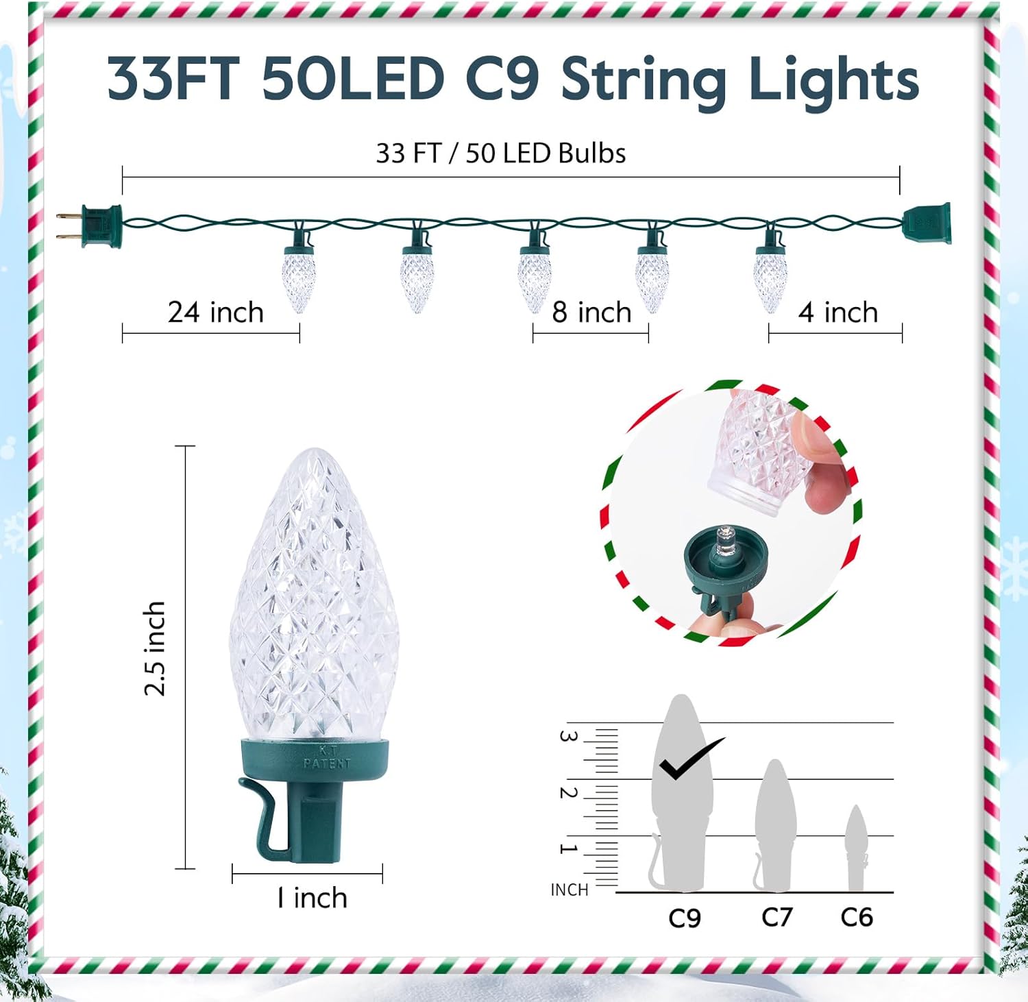 • 50 LED C9 Christmas Lights: The plug-in C9 Christmas lights are 33 feet long and feature 50 bright strawberry-shaped LEDs with 8-inch spacing between each bulb. Green cord is more suitable for Christmas tree decoration, adding a festive and warm atmosphere to your home.