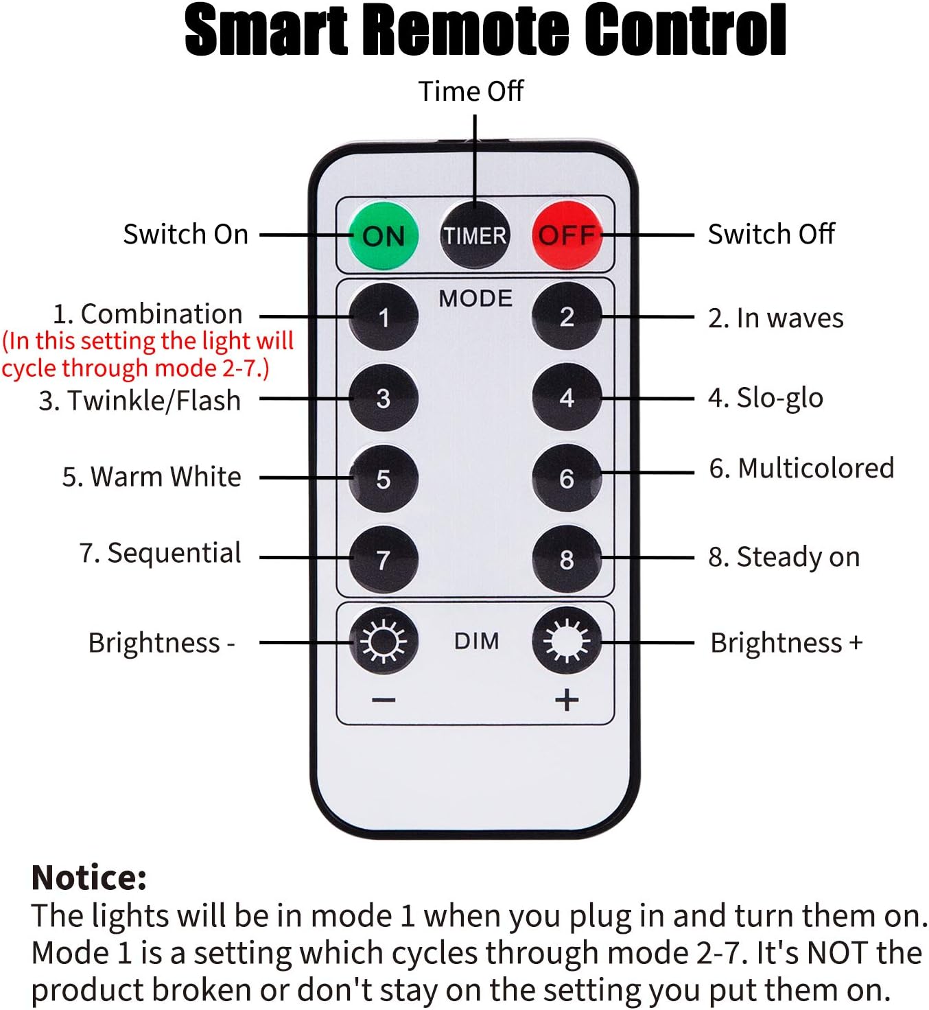 • Remote operation: Using the remote to turn on/off and control up to 16.4 Feet, press the TIMER button once to turn on for 6H lighting and turn off for 18H automatically every day. Press it again to cancel timer. Press the DIM - or + button repeatedly to set 4 level brightness. Press 1-8 button to switch to 8 amazing working modes