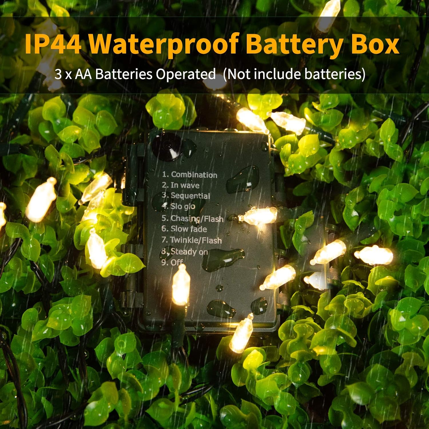 • 【Battery operated】3 AA batteries (Not included) operated, 2 pack 18 feet 50 mini LED strands, 3.94 inch lights spacing with compact water resistant battery control box, energy saving and eco-friendly. Operation time depends on the running time and the quality of installed battery