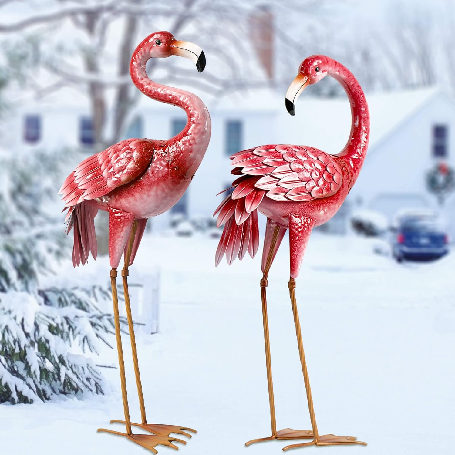 • Easy Assembly: The Legs of metal statues knock-down for shipping, no tools required for assembly. includes the 4 U-shaped stakes in the package to stabilize flamingos feet in the ground.