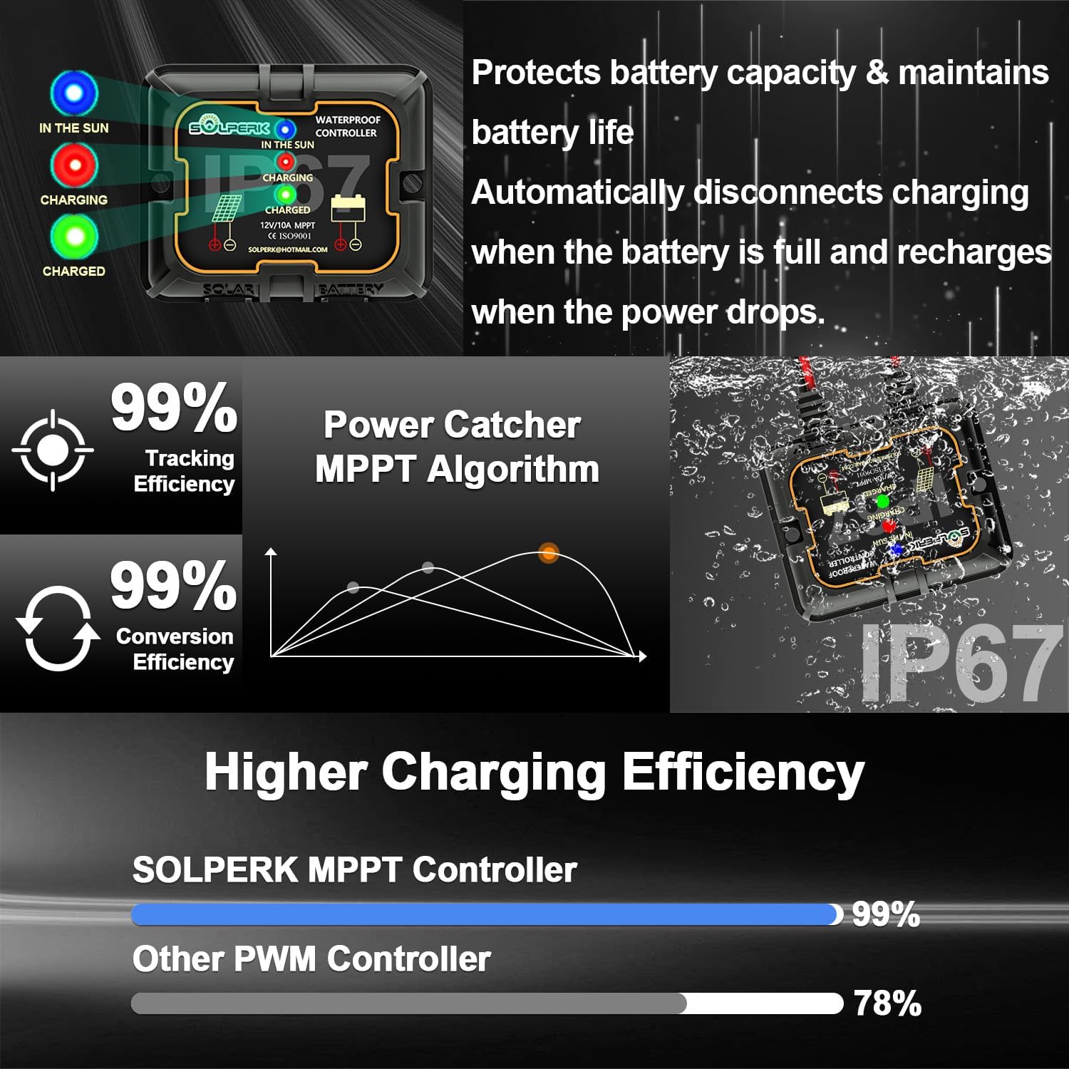 • 【Smart Charge Controller】The charging efficiency of this upgraded 8A controller is 20%-30% higher than other controllers on the market. Its intelligent three-stage charging design effectively prevents the battery from overcharging, over-voltage and short circuit. It takes no power from the battery. You will clearly know the charging status of the battery through the two indicator lights on the controller