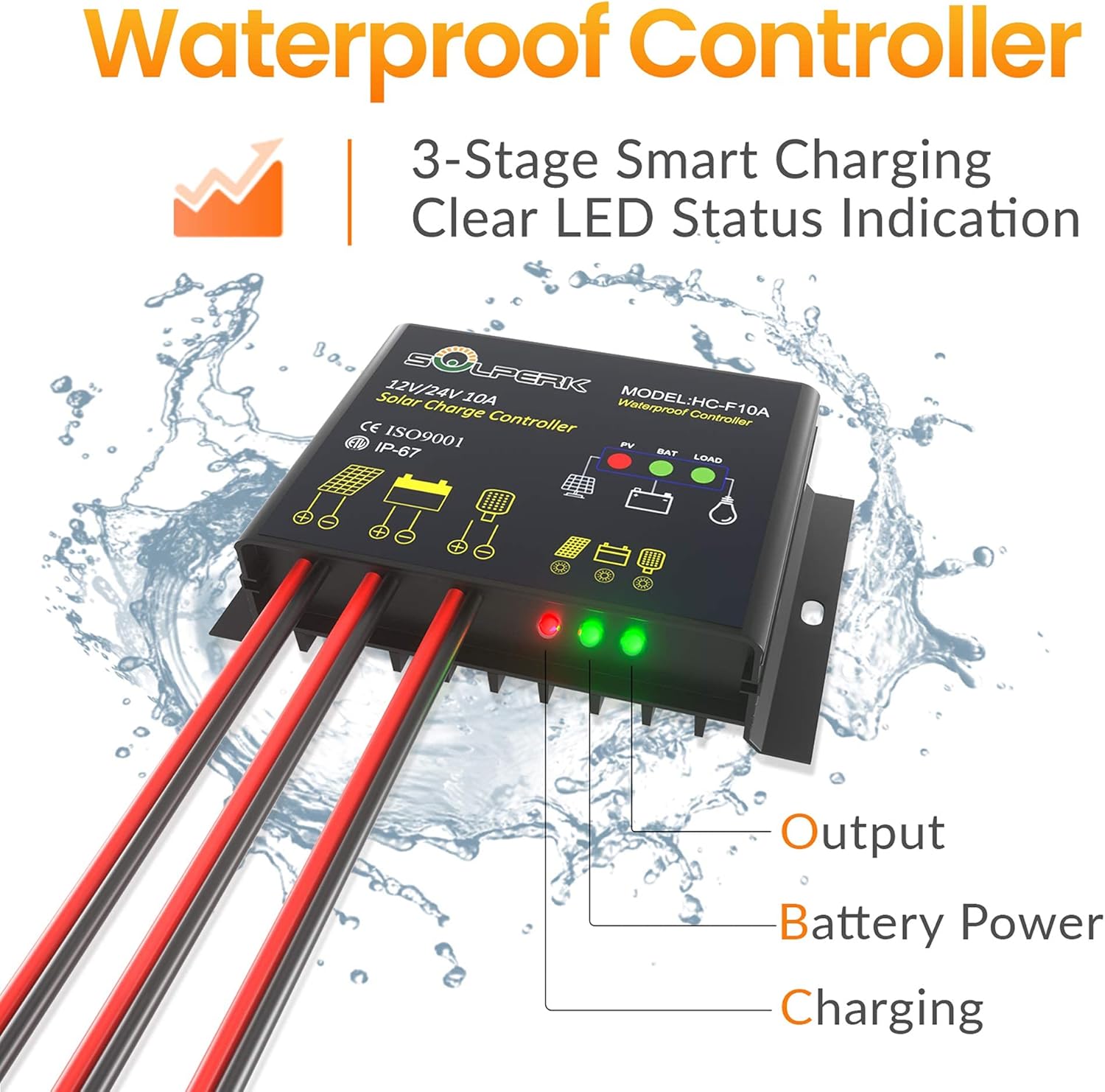 • 【Smart Charge Controller】IP65 waterproof charge controller. The charging efficiency of this upgraded 10A controller is 20%-30% higher than other controllers on the market. Its intelligent three-stage charging design effectively prevents the battery from overcharging. You will clearly know the charging status of the battery through the three indicator lights on the controller