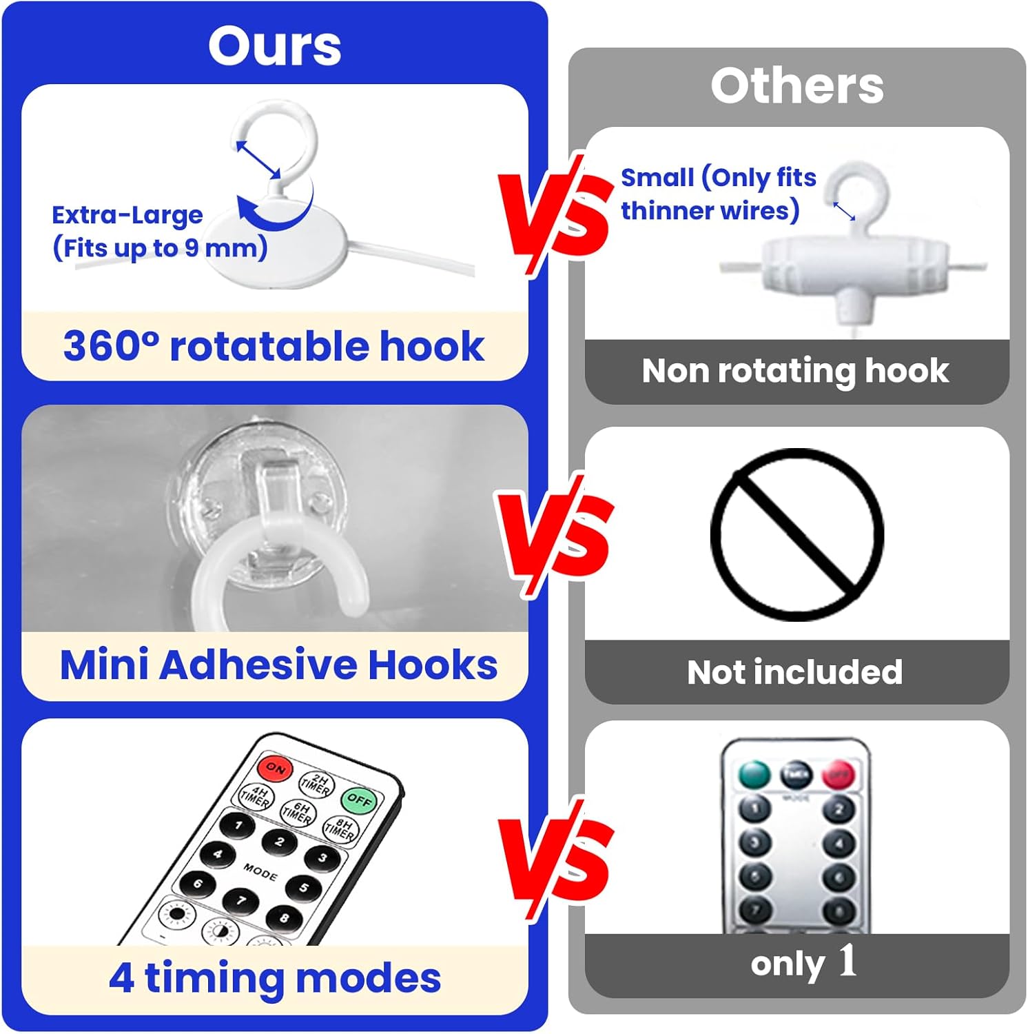 • 【8 Light Settings & Timer Remote】: Unlike others, our 17-Keys remote added 4 timing modes (2/4/6/8 hours on, 22/20/18/16 hours off). 8 different flash modes to choose from, and you can adjust the brightness of the lights by pressing "dim" ,“+” and "-". That are all controlled easily by a wireless remote at 10~15 meters, aim at the USB receiving direction when you press. All is in your control.
