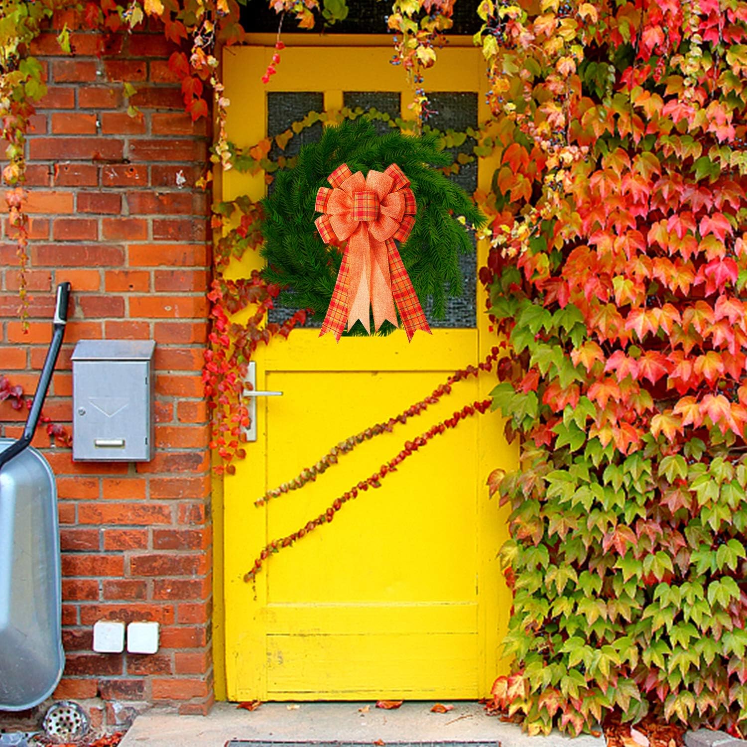 Iceyyyy Extra Large Fall Wreath Gift Bow -18.8x10.6inch Orange Buffalo Plaid Check Wreath Bow Swag Bow Thanksgiving Wreath Pre-Tied Bow For Fall, Thanksgiving, Christmas, Home Indoor Outdoor Ornaments
