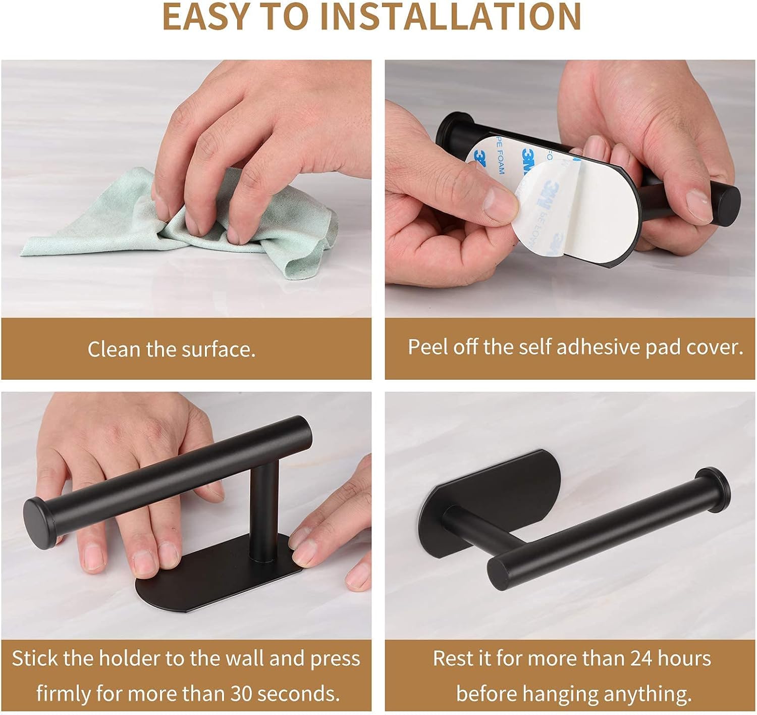 • WHAT'S IN OUR PACKAGE: Includes toilet paper holder, 2 adhesive sheets, installation manual.