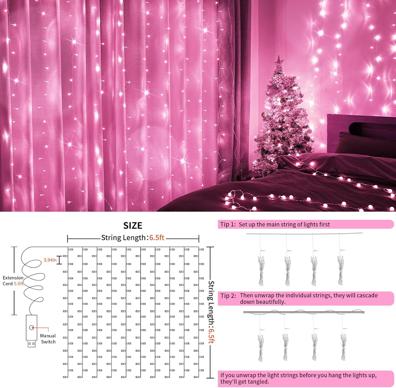 • [PINK CURTAIN LIGHTS] Hang the pink curtain lights to create a joyful cute bedroom. Pink fairy lights will be the optimum choice for introducing romance, cute and cozy to girls bedroom. Besides, a date night with pink string lights will be an unforgetable night. Choose pink lights for any romantic, cute, joyful scheme.