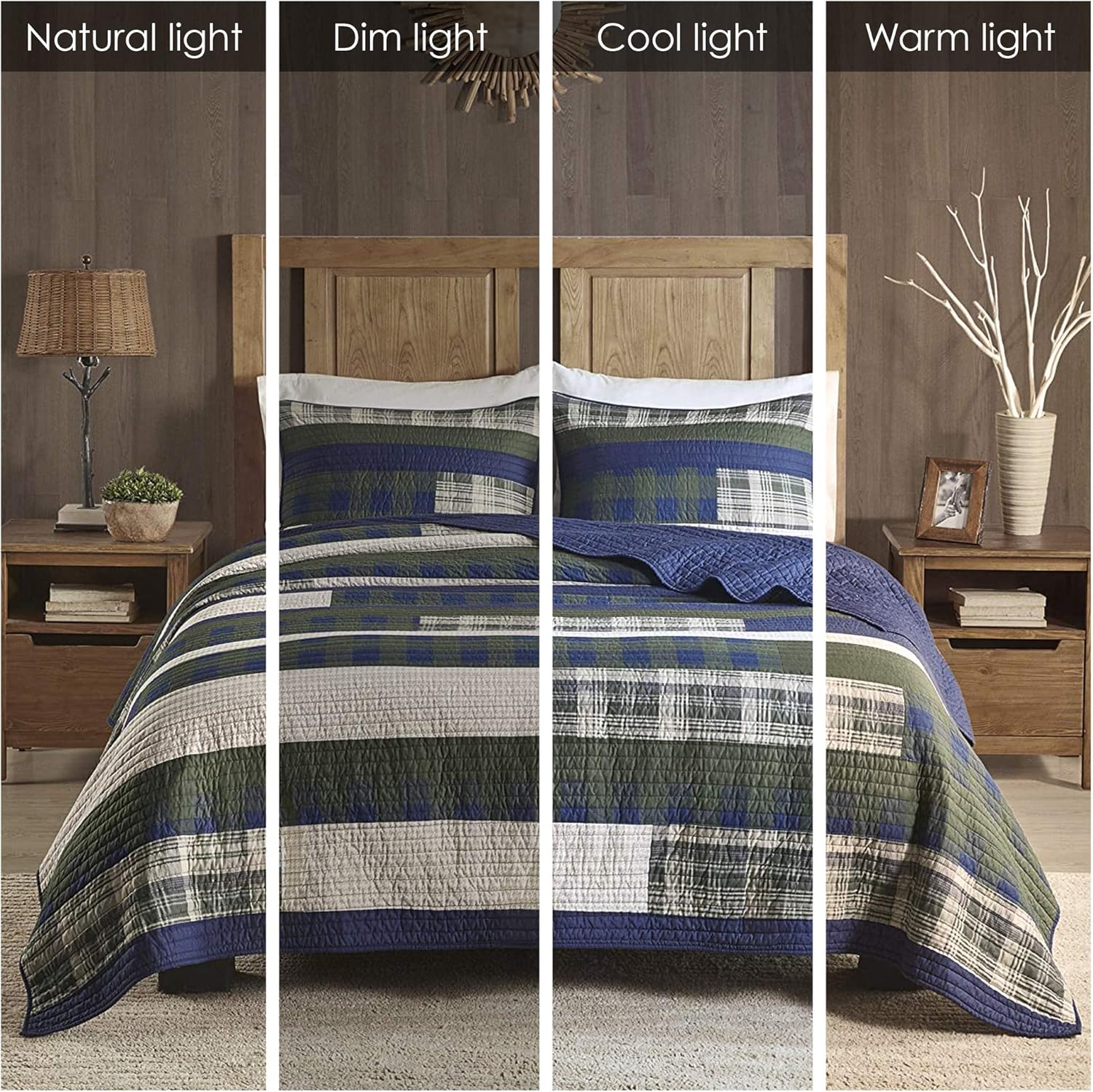 • The 100% cotton quilt features plaid pieced stripes in shades of green and blue and reverses to a solid blue color.