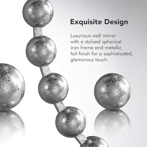• This round mirror features a stylized spherical iron frame finished with metallic foil, creating a bold and glamorous allure