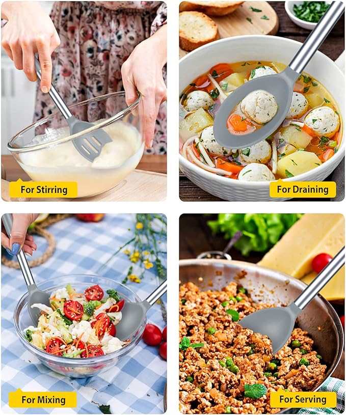 • Just Want To Provide The Ideas For You : Large cooking spoon used to hold food more convenient; Slotted Spoon can quickly drain the water; Whether it is used for draining or serving food, our large silicone cooking spoon will add more fun to your kitchen