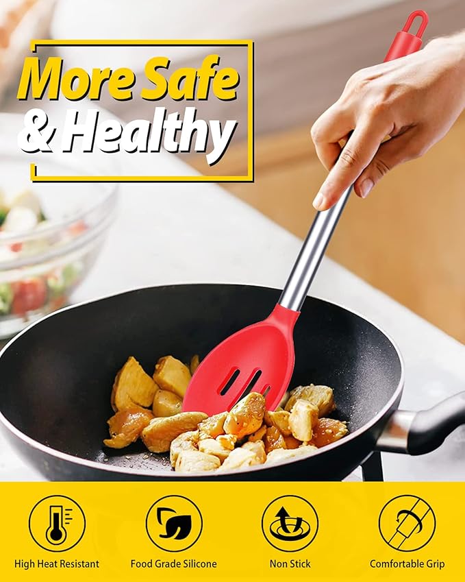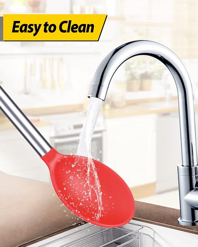 • More Safe and Healthy : Our silicone spoons are made of food-grade silicone, free of BPA;Even at high temperatures, there is no need to worry about melting or deforming;And the soft silicone head won't scratch the coating, it can better protect your pot