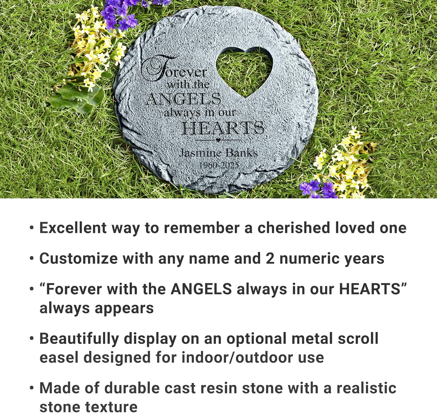 • UNIQUELY PERSONALIZED: Make their memory live forever. Customize your garden stone with their name laser-engraved up to 20 characters and 2 numeric years. “Forever with the Angels. Always in our Hearts" always appears.
