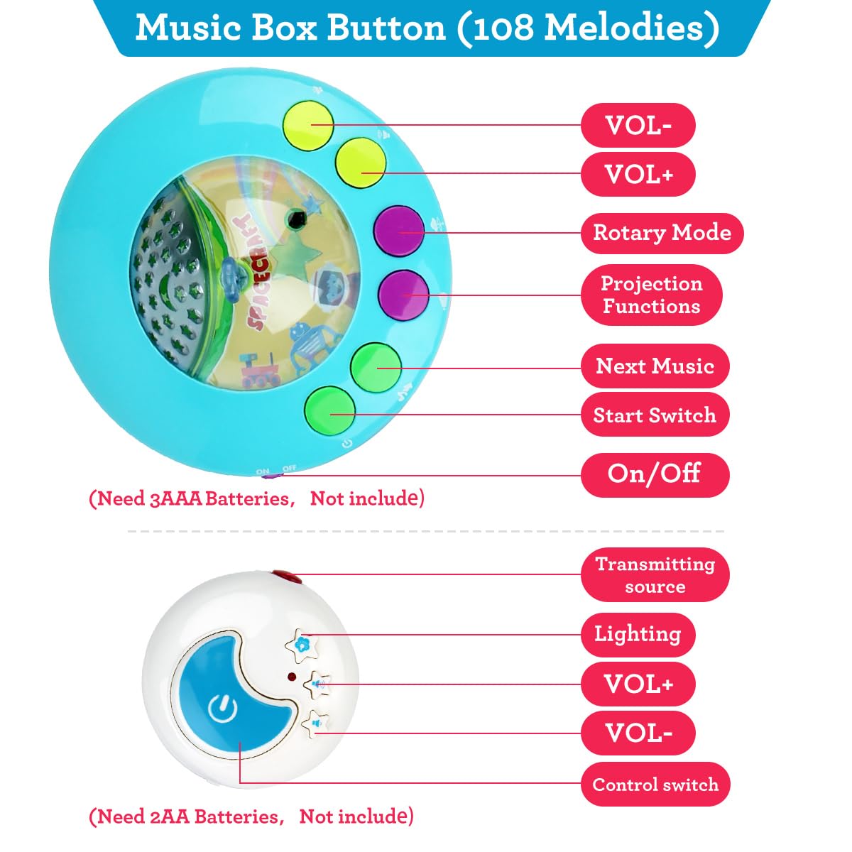 • Design and Features: The 360 rotation mobile with a remote control, the remote can control all the function in music box. Four cute airplane pendants spin slowly can attract the baby’s attention, help to exercise baby's eyesight. The cute hanging pendant can be taken off as small rattle toys