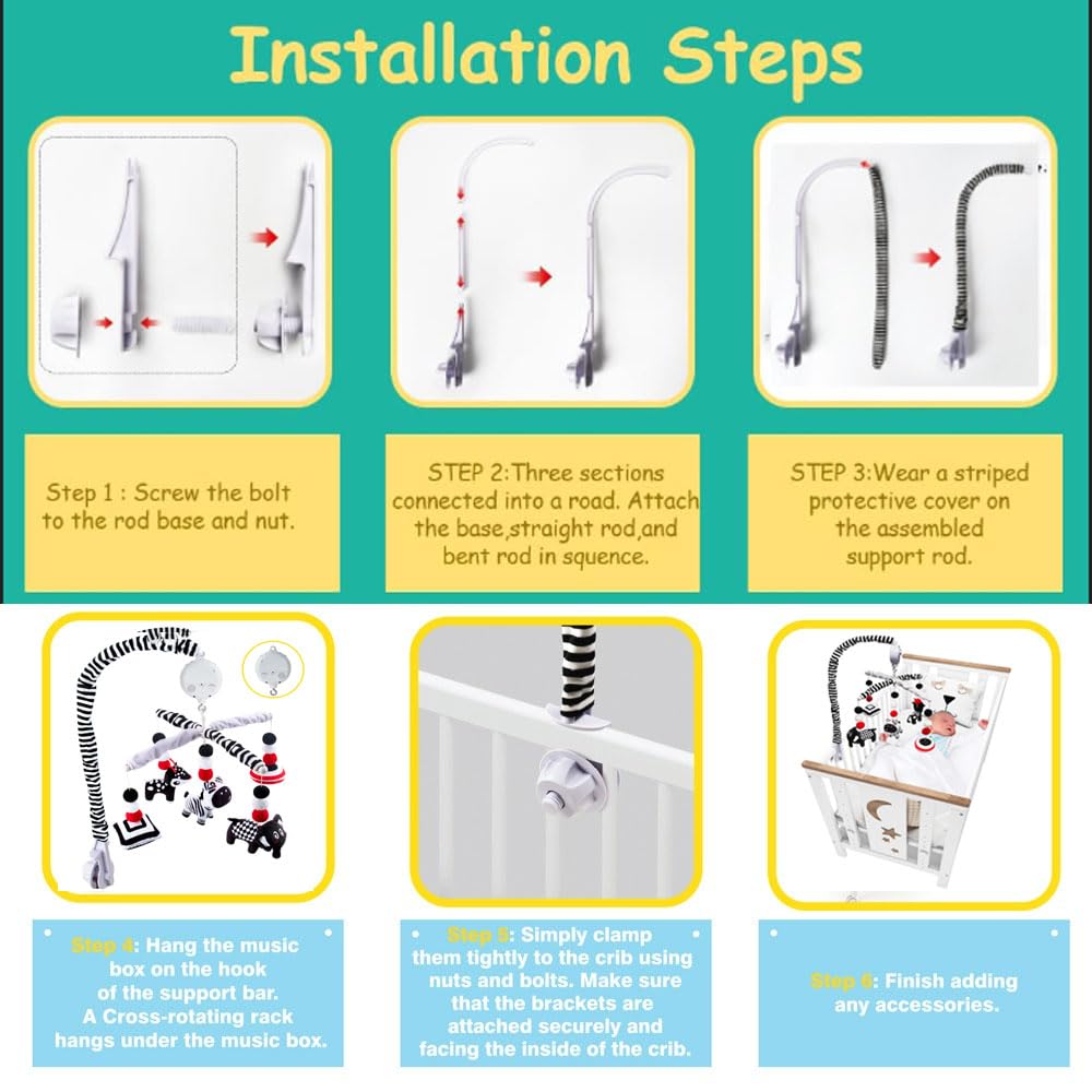 • ♫ MADE FOR BABY'S VIEW - UPGRADED MUSIC BOX, Easy to install, no screw needed,Requires 2 AA (not included). The baby mobile is made of safe ABS material, and the cute soft crib toys are handmade from high-quality stretch cotton, offer your baby harmless using experience. (Before Purchasing, please make sure the edge of your crib suitable for the baby bed holder). Crib mobiles keep your baby entertained, so you can have a little break or complete chores as your baby plays.