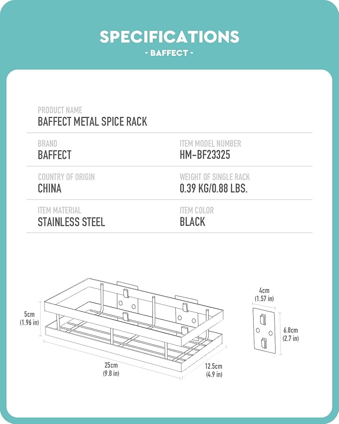 • [SPECIFICATION] There are 2 shelves in the package. Dimension of each spice rack is 9.8(L) x 4.9(W) x 2.7(H) inches, the net weight is 0.88lbs.