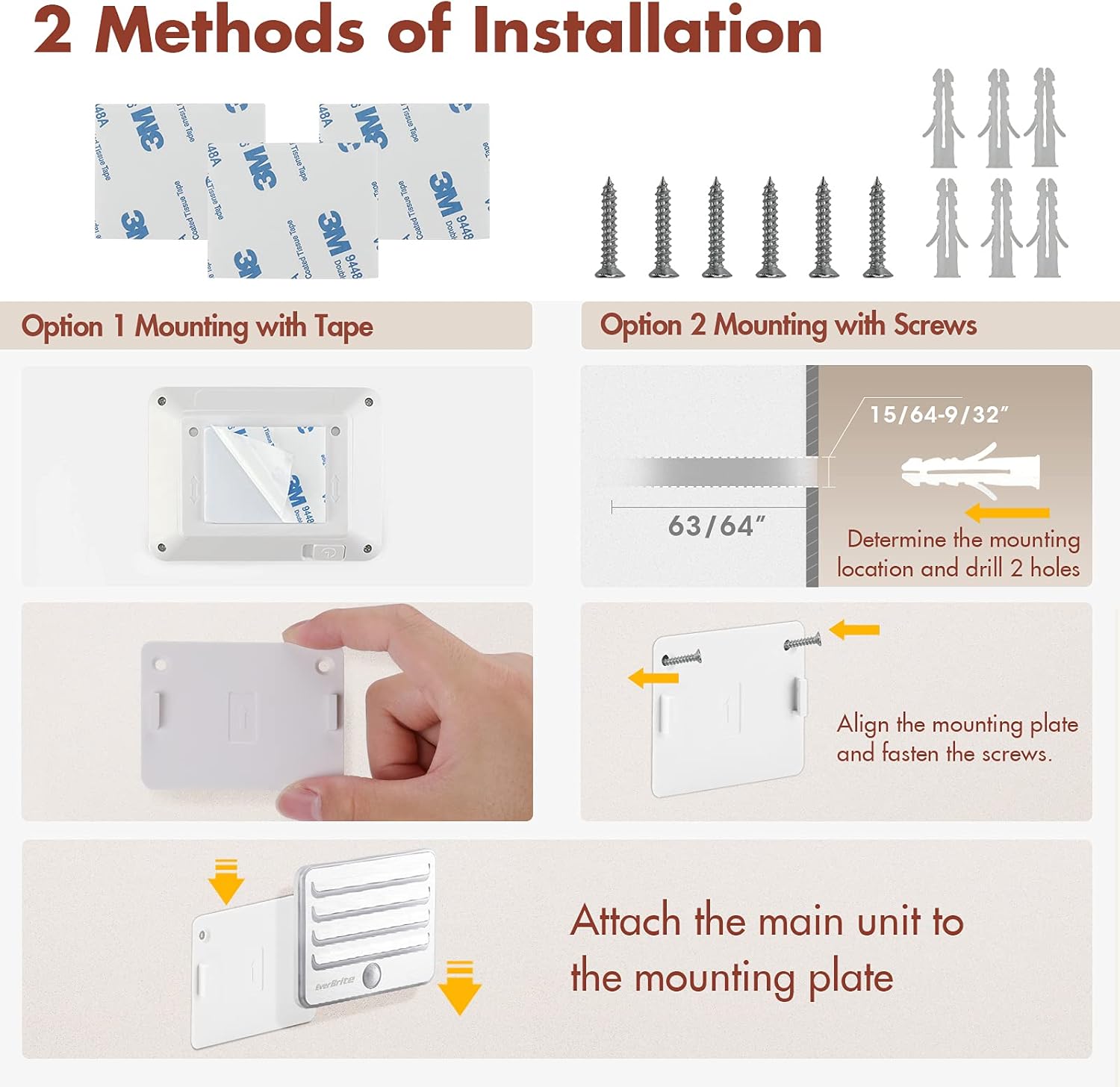 • Easy Installation: 1. Mounting with tape will leave no drill holes in the wall. 2. Mounting with screws: determine the mounting location and drill 2 holes, then put anchors into the holes and fasten the screws.