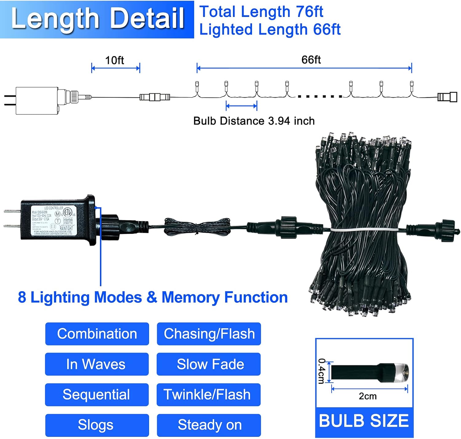 • 【Extendable Blue Outdoor Lights】Total Length: 76ft, lighted length: 66ft, lead wire length: 10ft, space between LEDs: 3.94 inch, wire color: green. Blue string Lights, with male and female safe plugs, could be extended up to 5 sets. Ideal for outdoor and indoor use of Christmas.