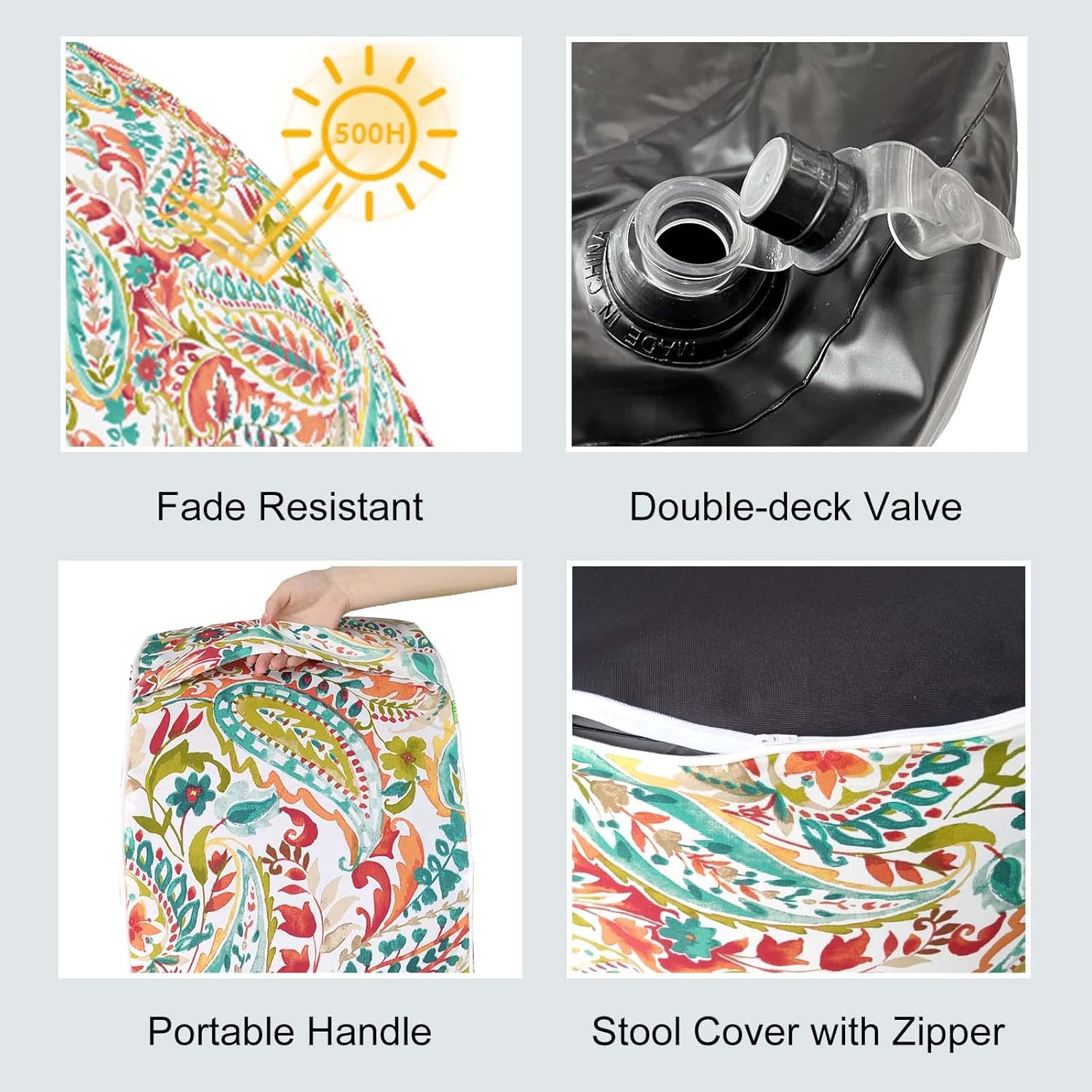 • SAFETY COMES FIRST: 250 micrometer PVC liner ensures lasting durability against tears and punctures; outdoor ottoman is light weighted enough to carry, but can also bear up to 220 pounds (100kg). It brings you comfort and sense of safety even if an adult sit on it.