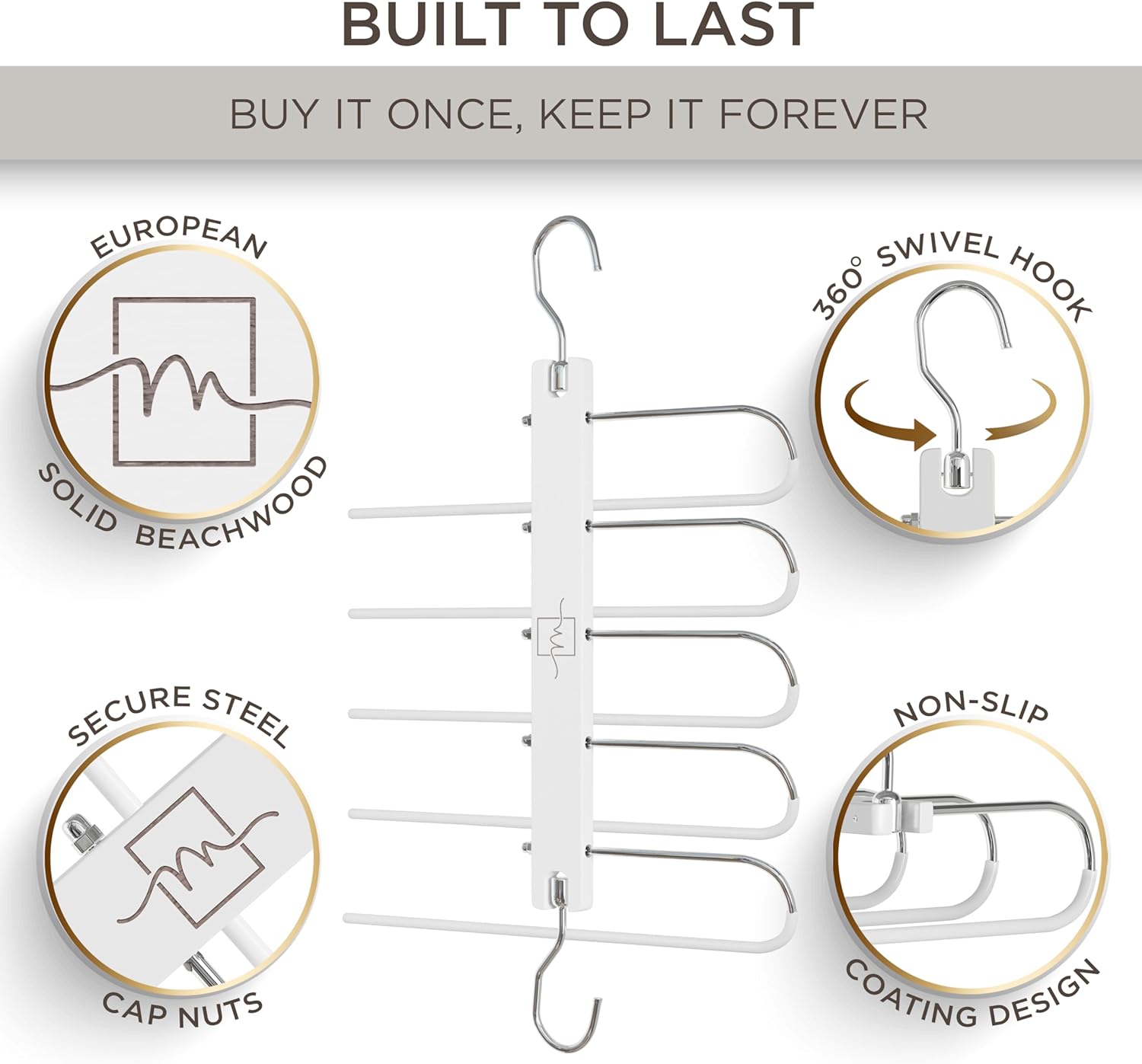 • PREMIUM QUALITY BEECH WOOD - Our beech wood gives you a durable and sturdy clothes hanger organizer built to last. Whether using for light scarf storage or heavy pants our multi functional pants holder will not not bend or collapse thanks to our quality crafted beech wood hanger organizers.