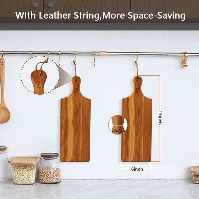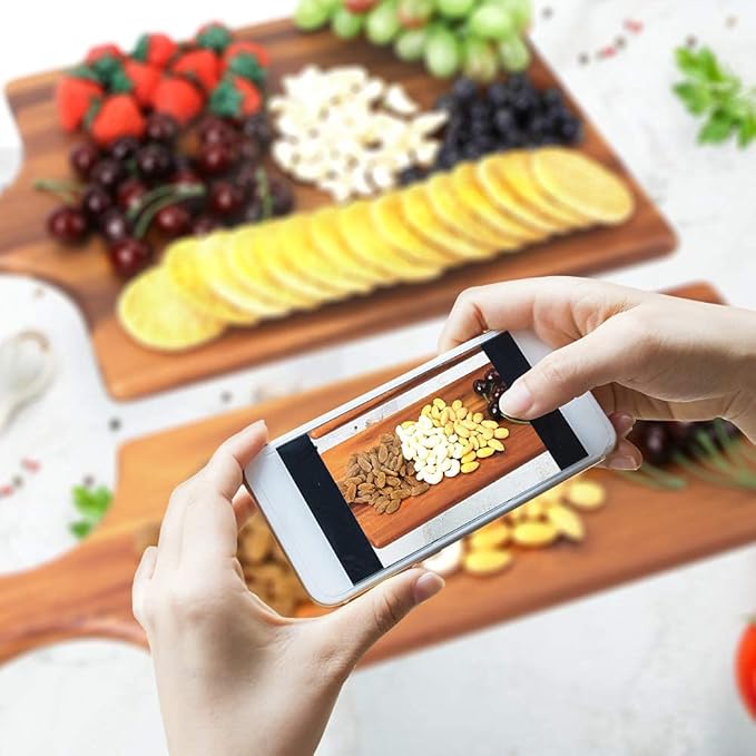 • Suitable Size: Acacia wood cutting board cheese board serving tray; measures 17 inches long with handle, 6 inches wide, 0.5 inches thick; ideal for serving bread, cheese, sandwiches, and party snacks at the table