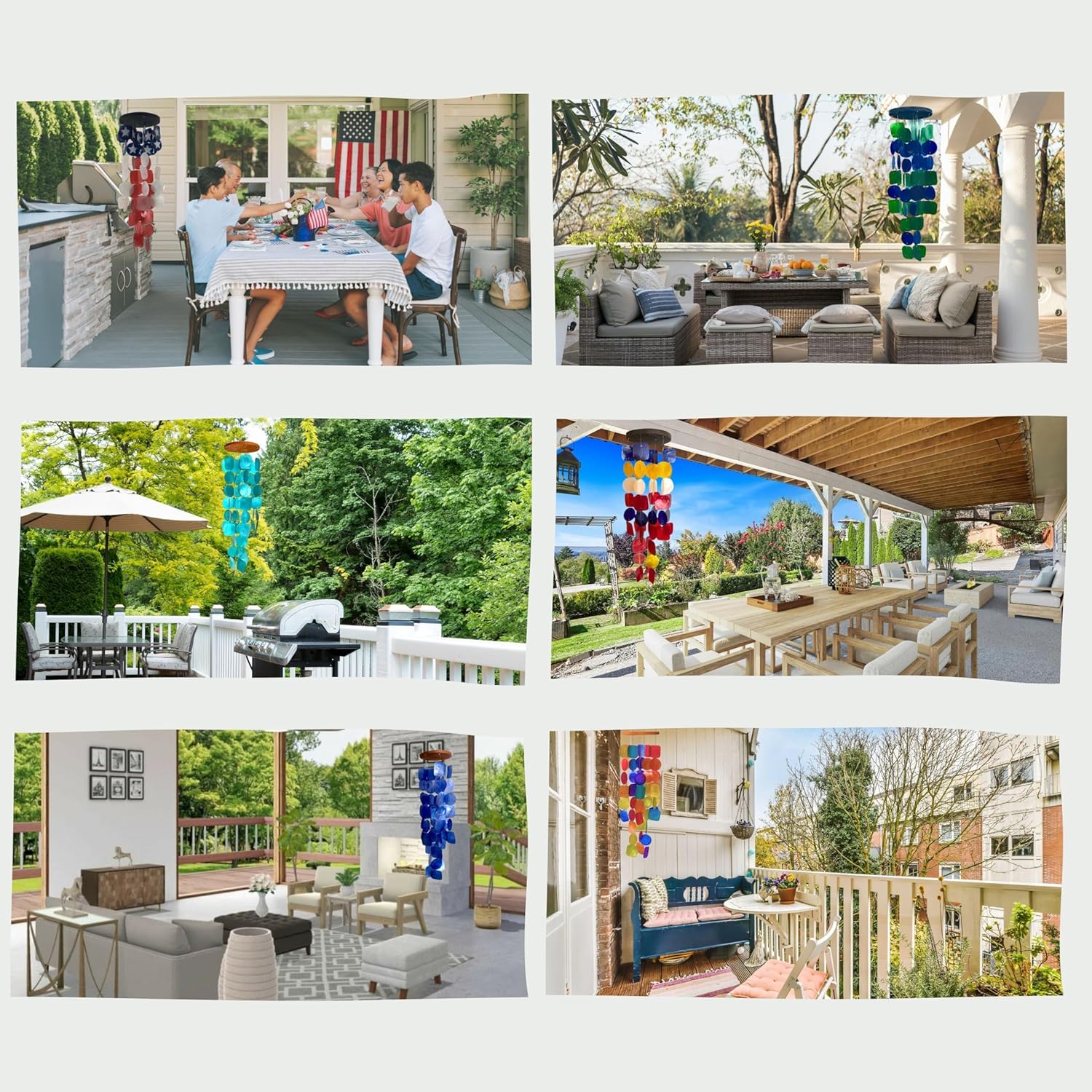 • Unique Wind Chimes: Our colorful outdoor windchimes are strong and long lasting, composed of natural capiz seashells glass, and wood, measuring 27 inches in length.