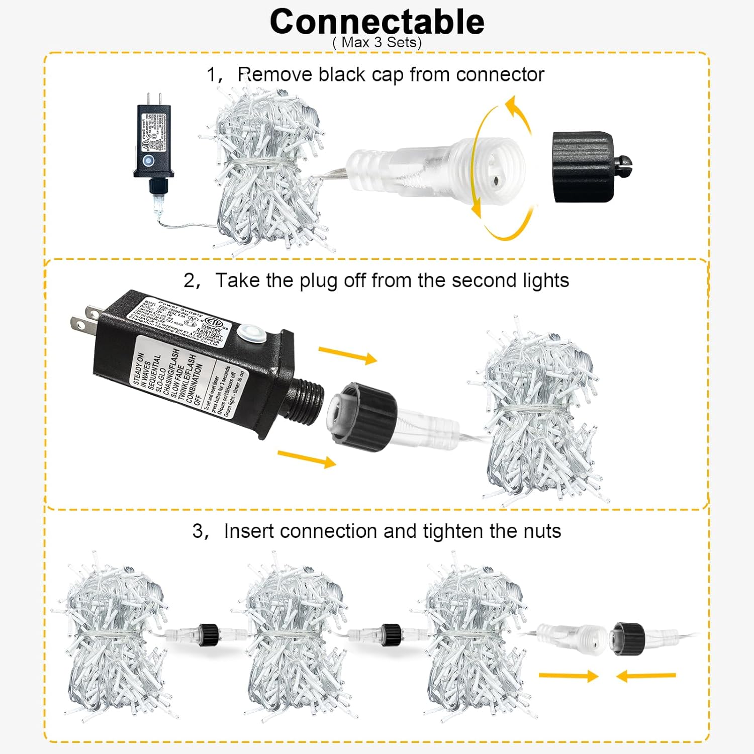 • Low Voltage & UL Certification: The output voltage of the led icicle Christmas lights outdoor is 29V, the power of adapter is 6W with UL certified, energy saving and safe to use. The twinkle lights will not overheat even after working for a long time and safe to touch.