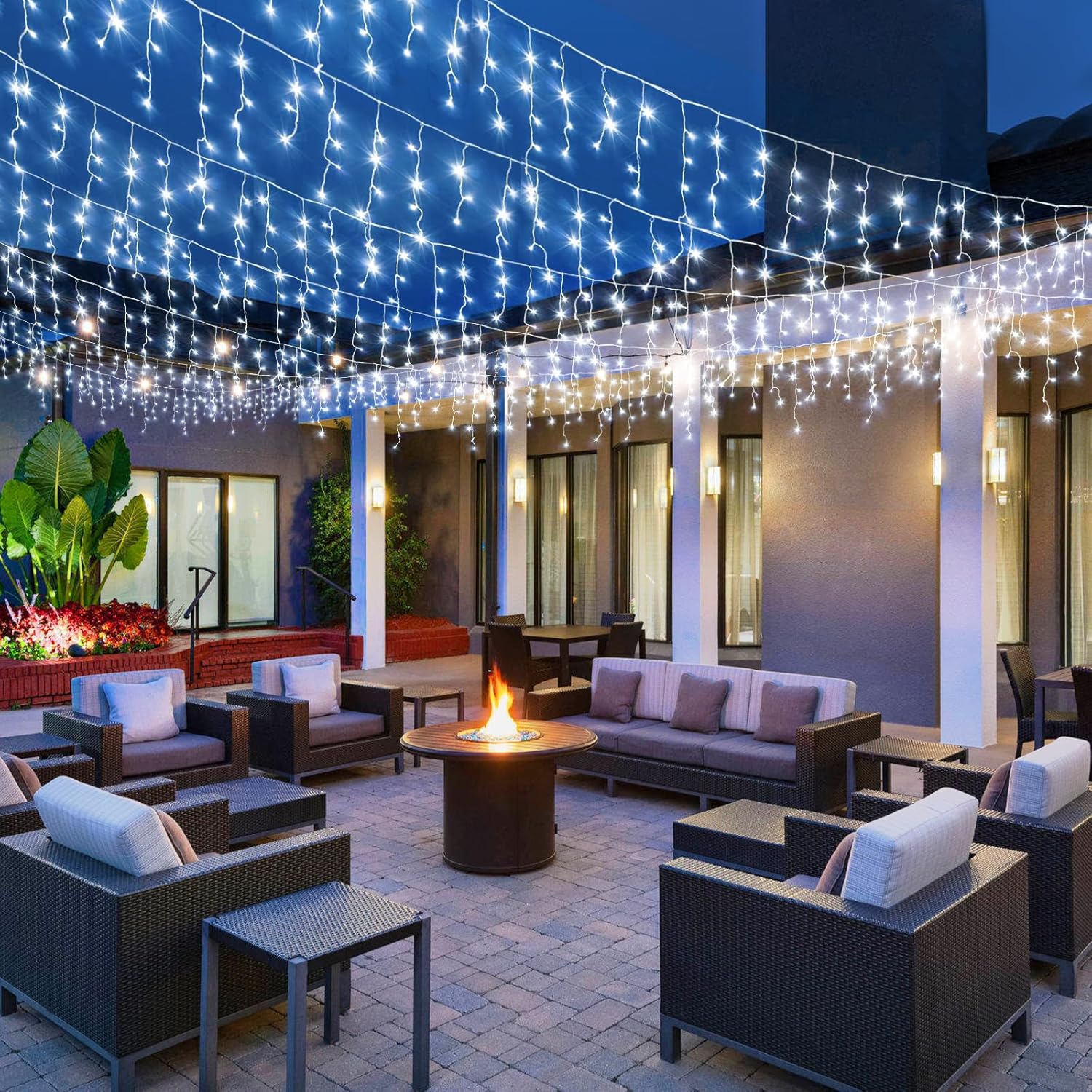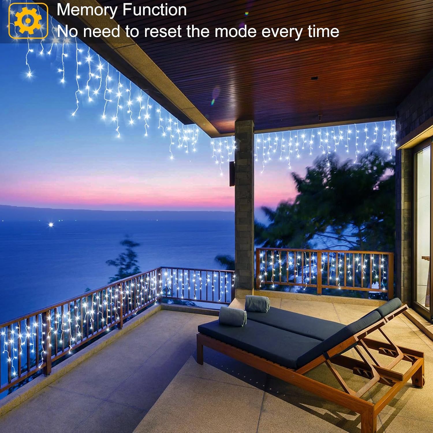 • Upgraded 8 Modes Icicle Lights for Outside: The Christmas Lights outdoor have 8 selections of light pattern: 1.Combination 2.In Waves 3.Sequential 4.Slo-Glo 5.Chasing/Flash 6.Slow Fade 7.Twinkle/Flash 8.Steady On. Different lighting effects are controlled by the button on the plug. These beautiful and vibrant white Christmas lights will bring you a lot of festive atmosphere.