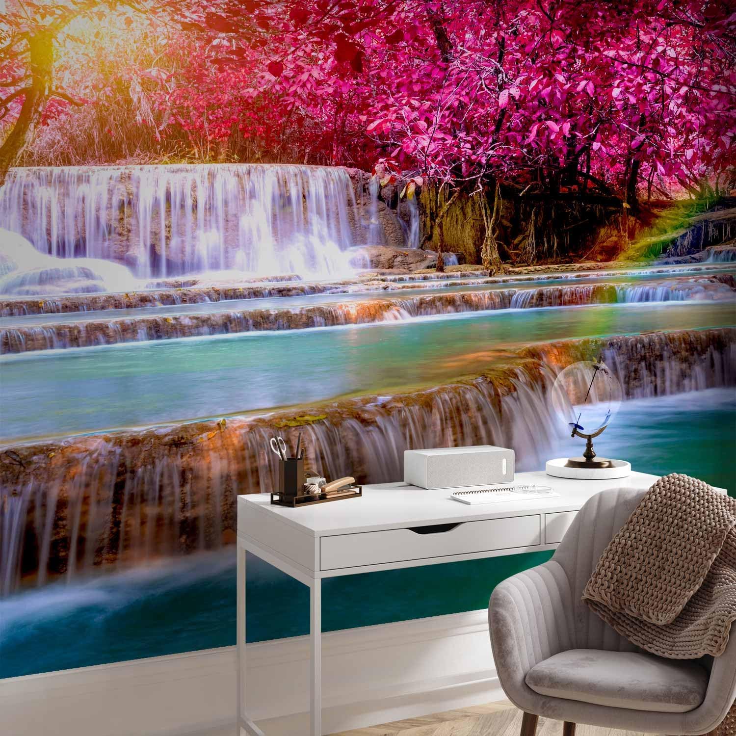 artgeist Wall Mural Waterfall 216x98 in - XXL Non-Woven Corner Wallpaper Fleece Angle Wall Decor Photo Print Picture Image Design Modern Nature Sun Pink Tree Forest c-B-0474-a-a
