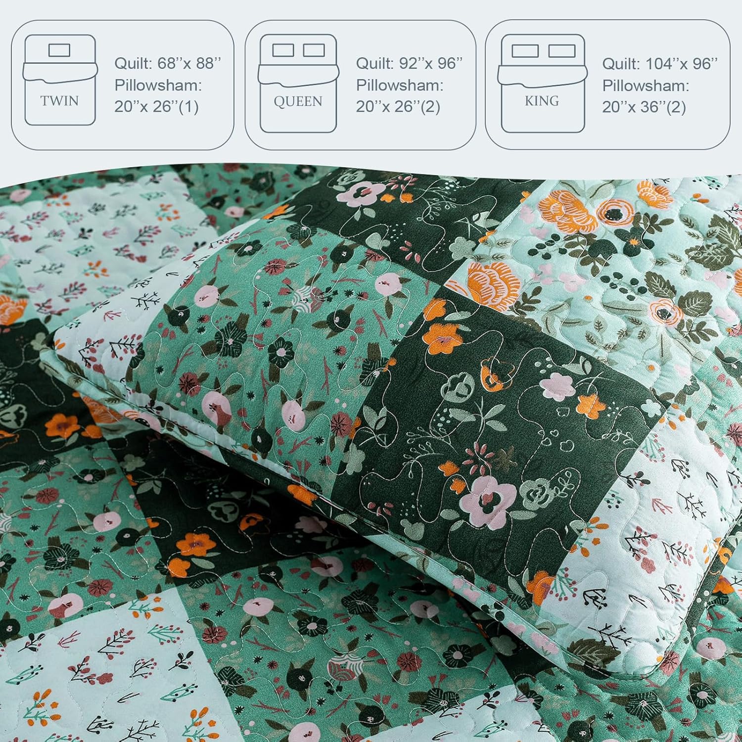 • Design: Pastel green floral patterns are carefully printed on this quilt bedding set. Thanks to the high-tech digital print technology, this bed cover could keep its vibrant colors and patterns from fading after washing