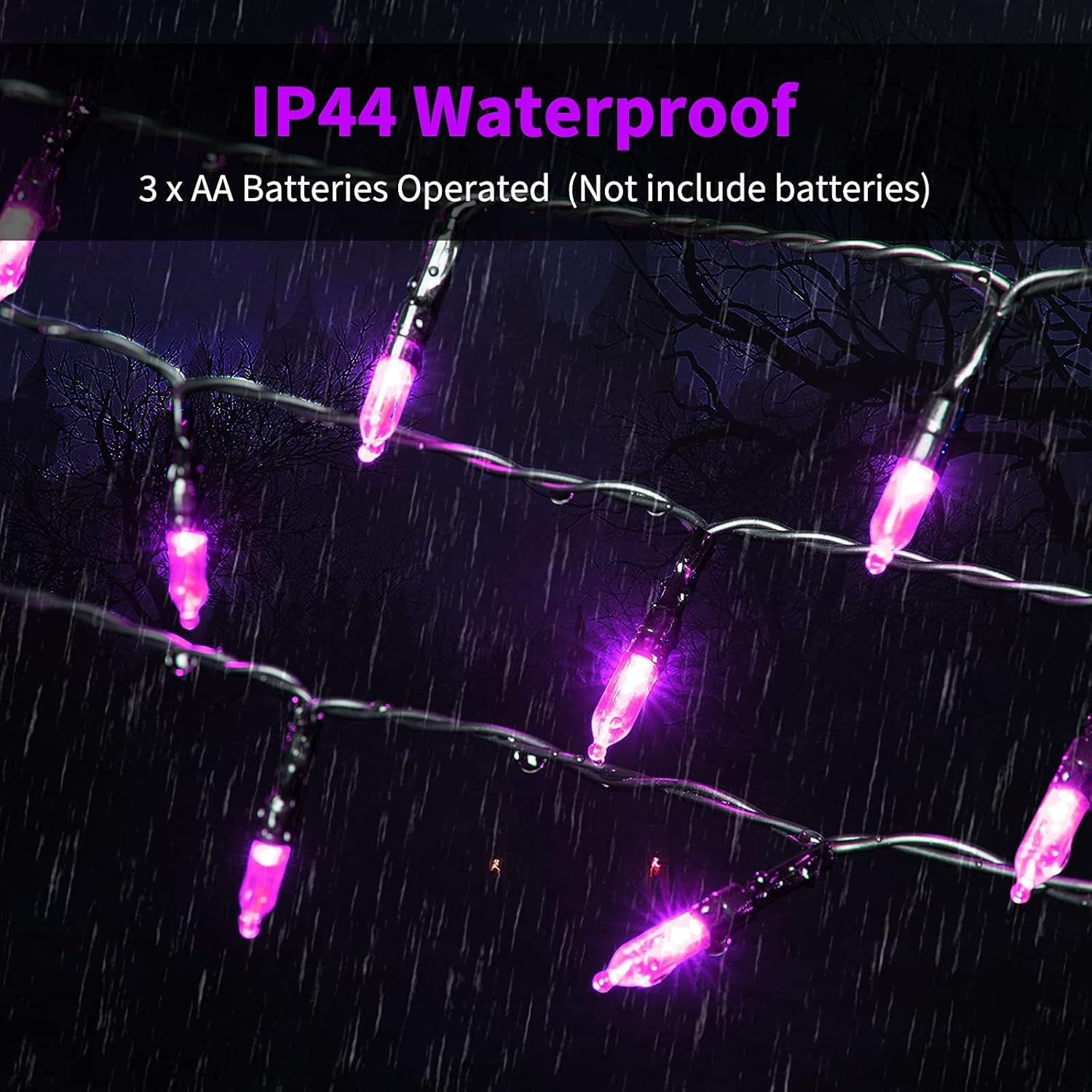• Battery Operated Halloween Decorations: 3 “AA” batteries (NOT included) operated, 50 LED Halloween decor purple string lights, water-resistant battery case, amazing match for the haunted stuff like the skeleton, ghost, witch hat, and more. Portable for outdoor camping, festival decor