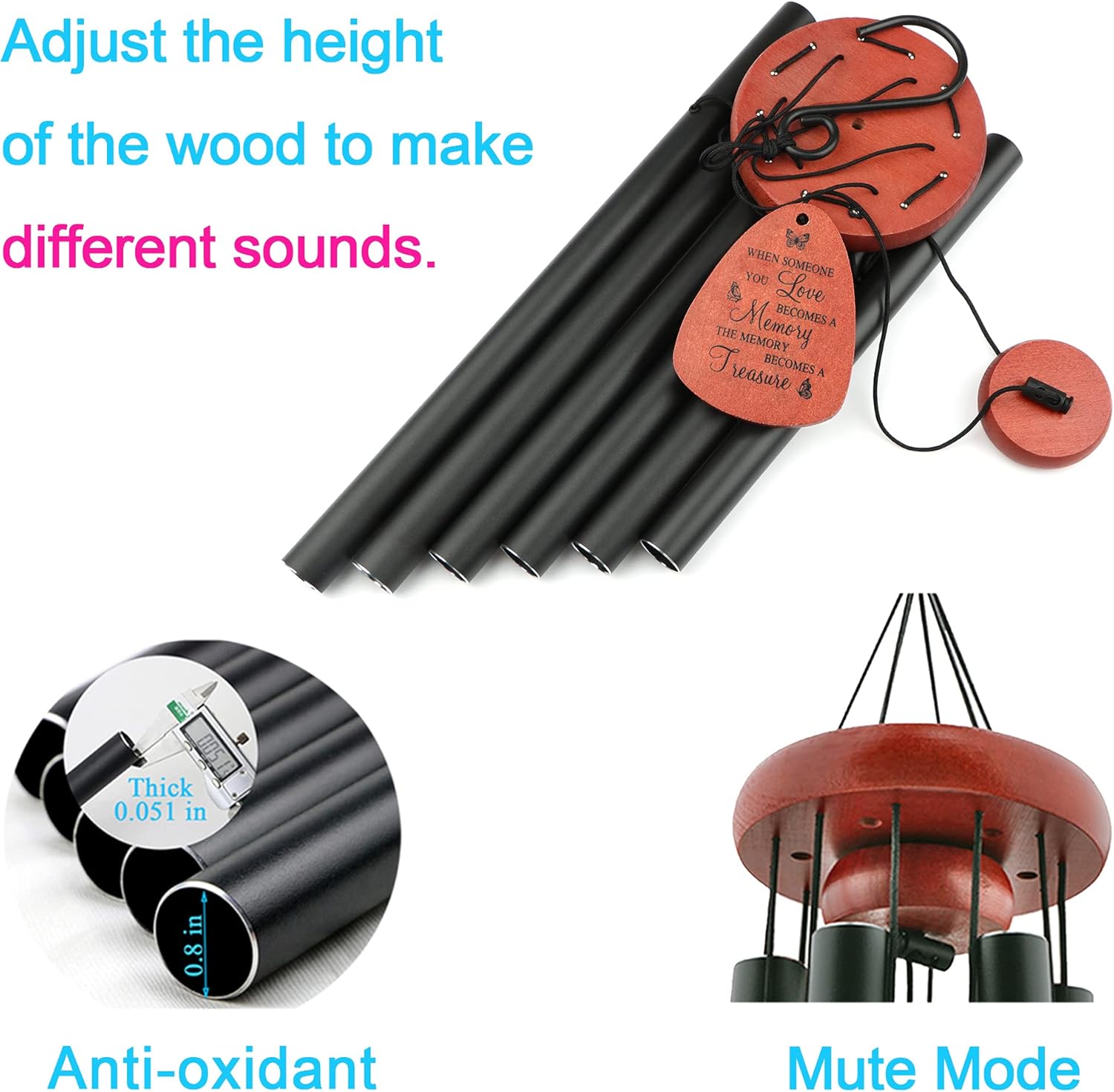 • Premium Quality Memorial Wind Chimes: Made with high-quality aluminum tubes and a corrosion-resistant black anodized finish, these memorial wind chimes produce clear, beautiful tones. The bell holder, striker, and wind catcher are made from durable beech wood, and the entire structure is supported by a strong, weather-resistant nylon cord for lasting outdoor use