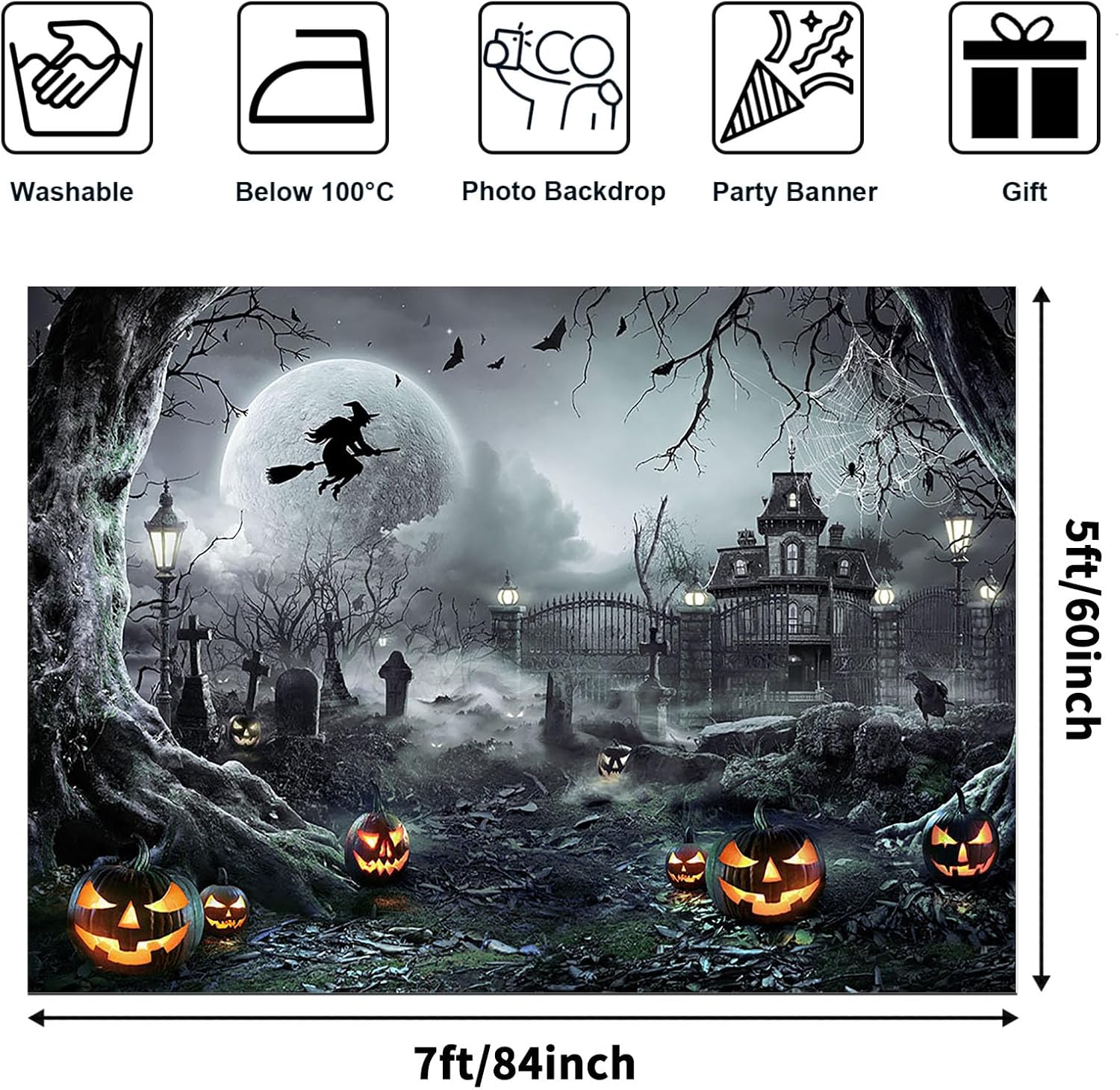 • Proper Size: The Halloween photography backdrop size is 7x5 ft (width: 84 inches, height: 60 inches), foldable for shipping; The size is large enough to be paired with holiday related balloons, garland kit, props, and tablecloths to create a perfect party