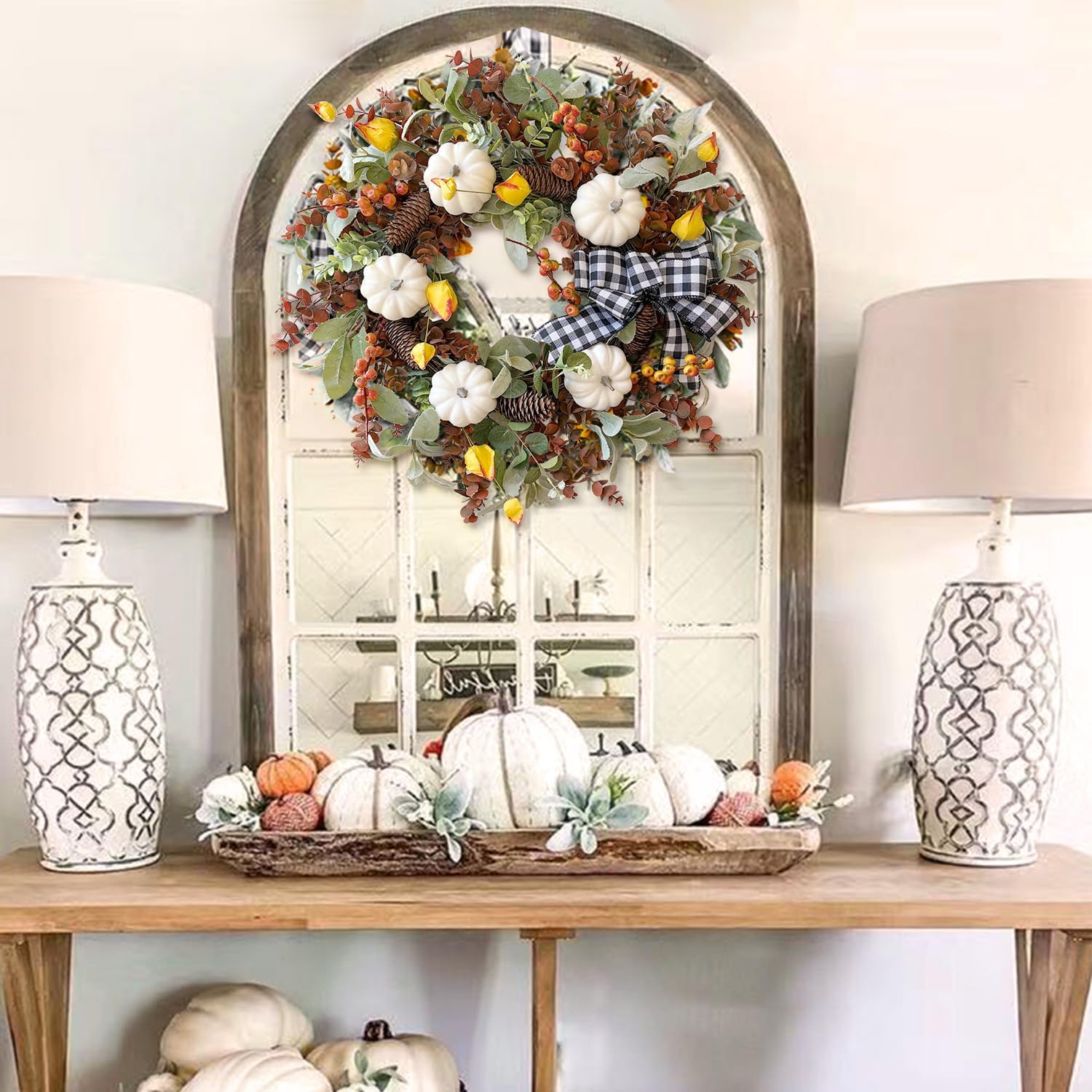 WANNA-CUL 24 inch Large Farmhouse Fall Wreath Decor for Front Door with White Pumpkin,Cotton,Lamb's Ear and Eucalyptus Leaves,Harvest Door Wreath for Autumn or Thanksgiving Decorations