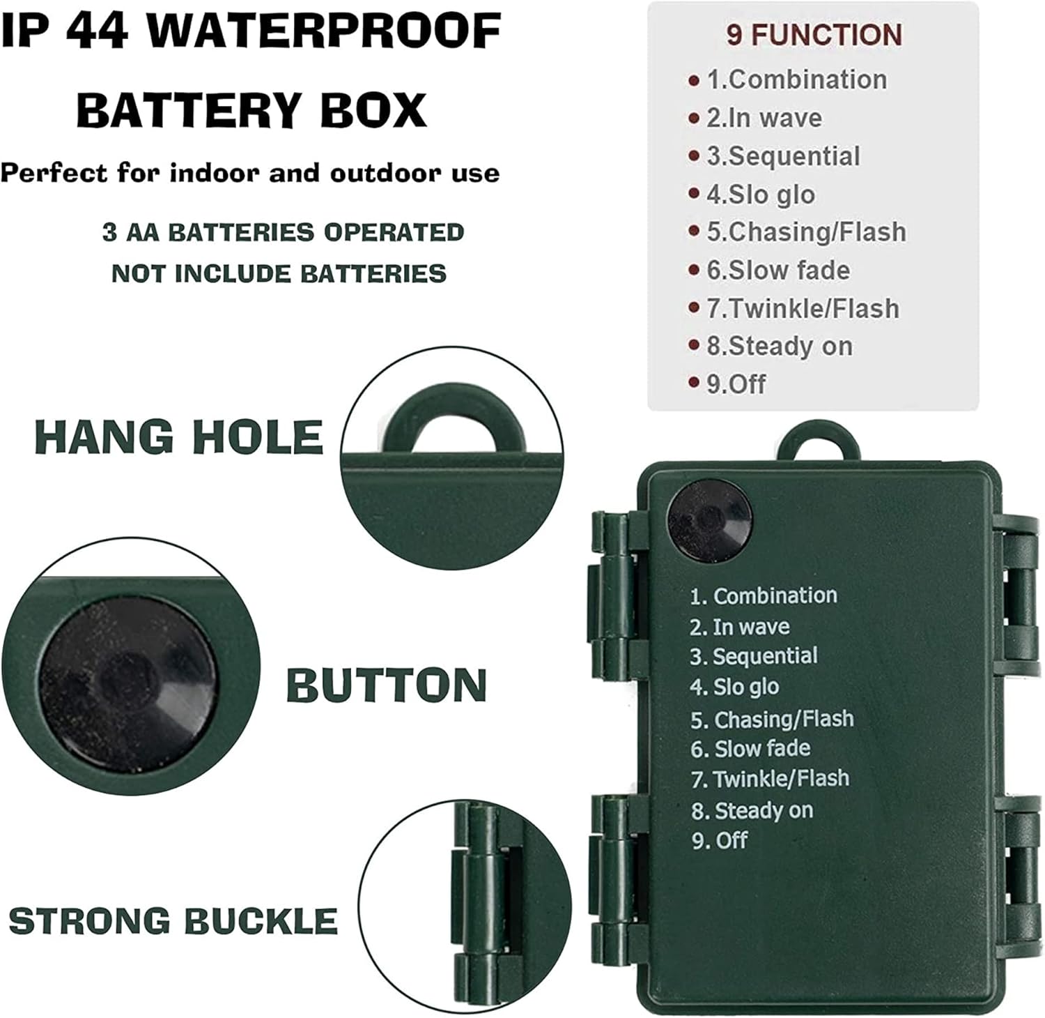 • Waterproof & Safety: Both the Battery box and fairty string lights are IP 44 waterproof. Perfect for outdoor festival Xmas decorations required. It won't over heat after long time working and is safety for touching, no danger to kids and pets. The sturdy bulb fits seamlessly with the socket to ensure a firm installation and will not fall during use.