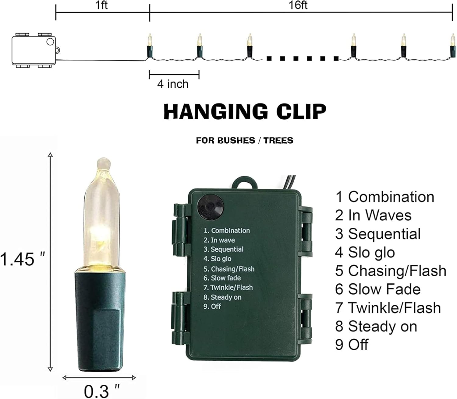 • 8 Lighting Modes: Dazzle Bright mini string lights has 8 different lighting methods, including combination, in wave, sequential, slo glo, chasing/flash, slow fade, twinkle/flash, steady on. Press the button on the battery box to select the lighting mode you like.