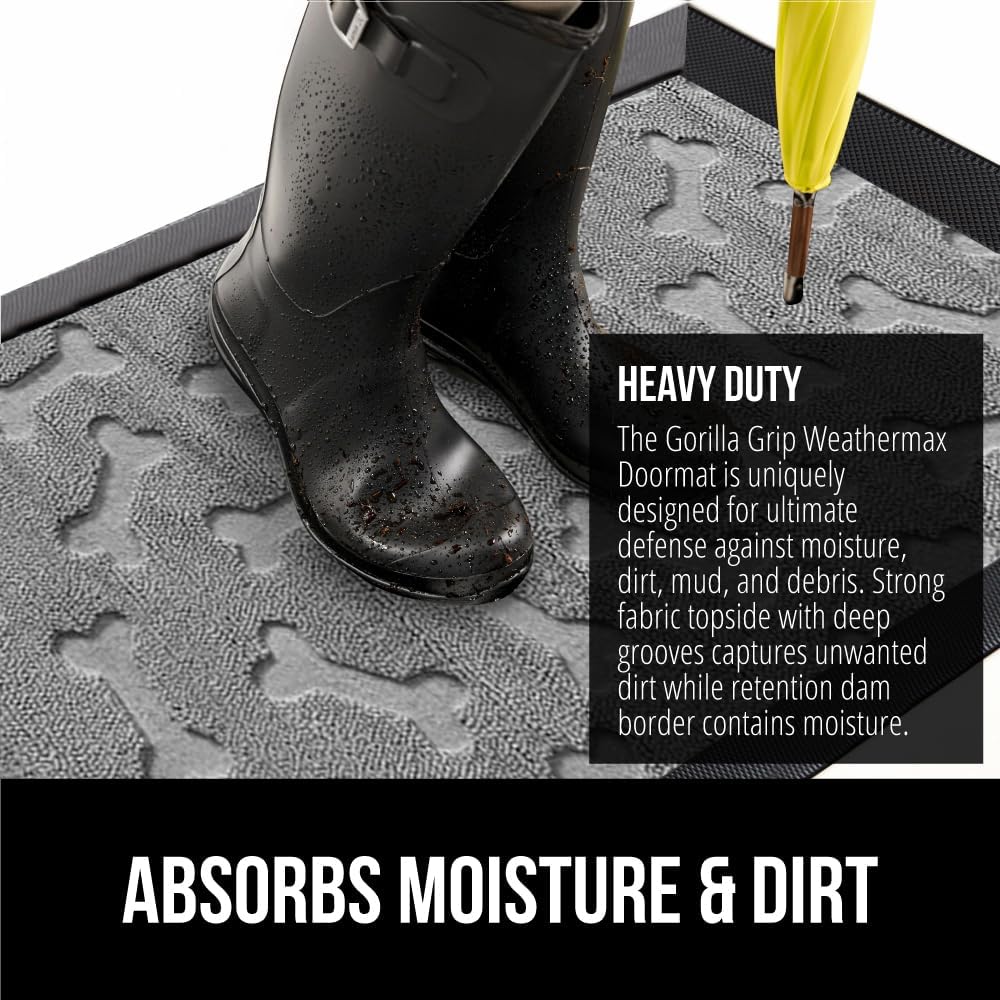GORILLA GRIP 100% Waterproof All-Season WeatherMax Doormat, 47x35, US Designed Natural Rubber, Stain and Fade Resistant, Low Profile Indoor Outdoor Door Mats, Easy Clean Patio Mat, Light Gray Bones