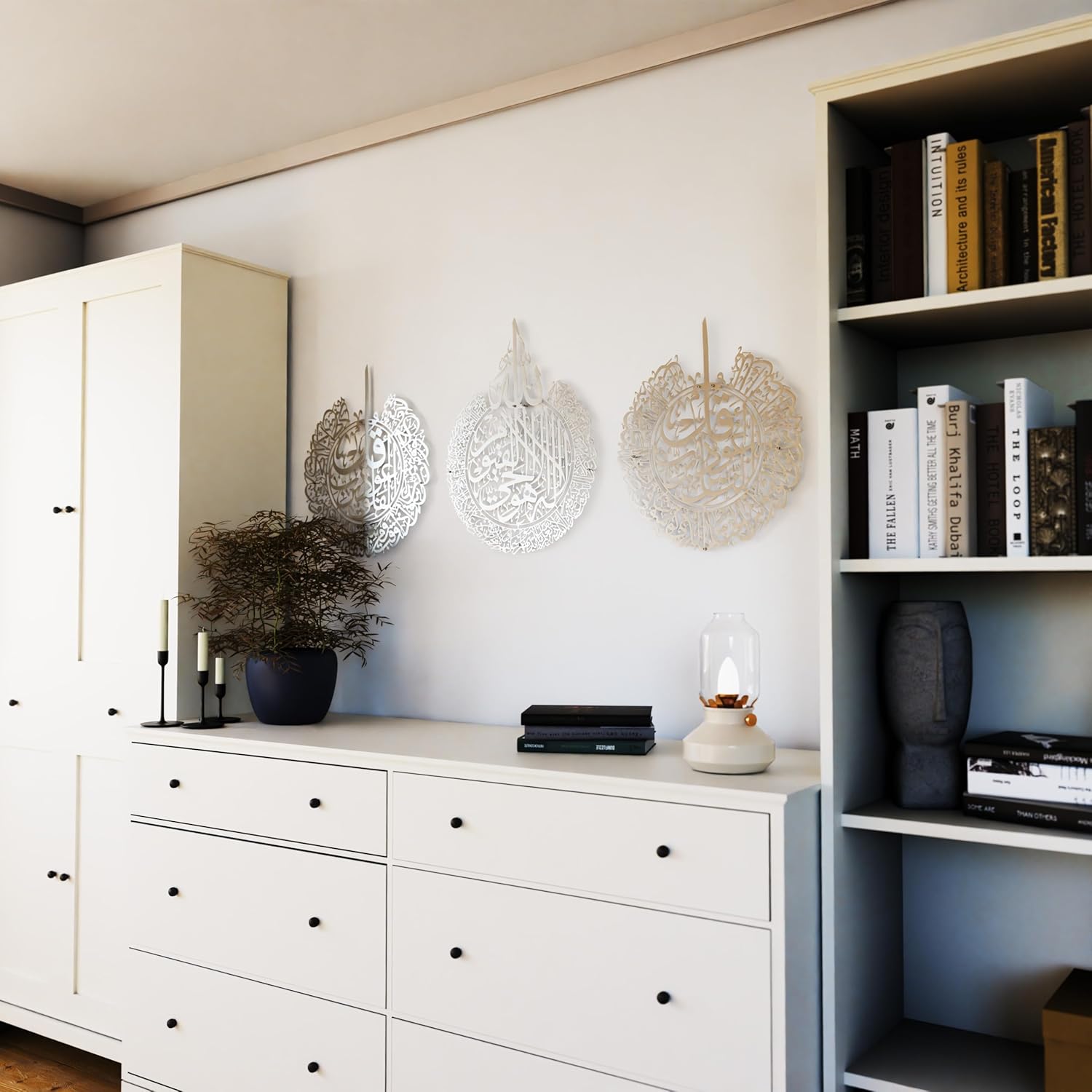 IWA CONCEPT Metal Set of Ayatul Kursi, Surah Al Falaq and Surah An Nas | Islamic Ramadan Wall Decorations | Modern Muslim Housewarming Gift | Calligraphy | Quran Wall Art | (Matte Silver, Large)
