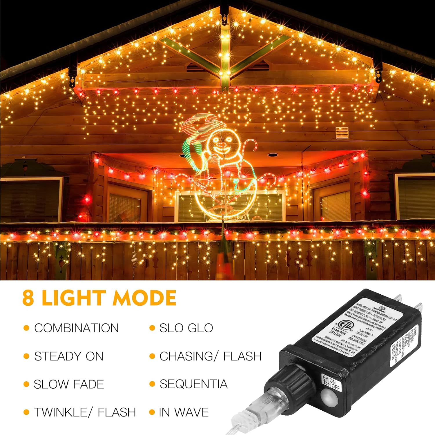 • 【8 Lighting Modes】 Icicle string lights with 8 different light patterns: Combination, In waves, Sequential, Slo-Glo, Chasing/Flash, Slow fade, Twinkle/Flash and Steady on(Tips: Slow fade is a pattern of alternating half-bright and half-off. If you receive the goods and find that half of the lights are not on, it is not a defective product, just switch to other modes).